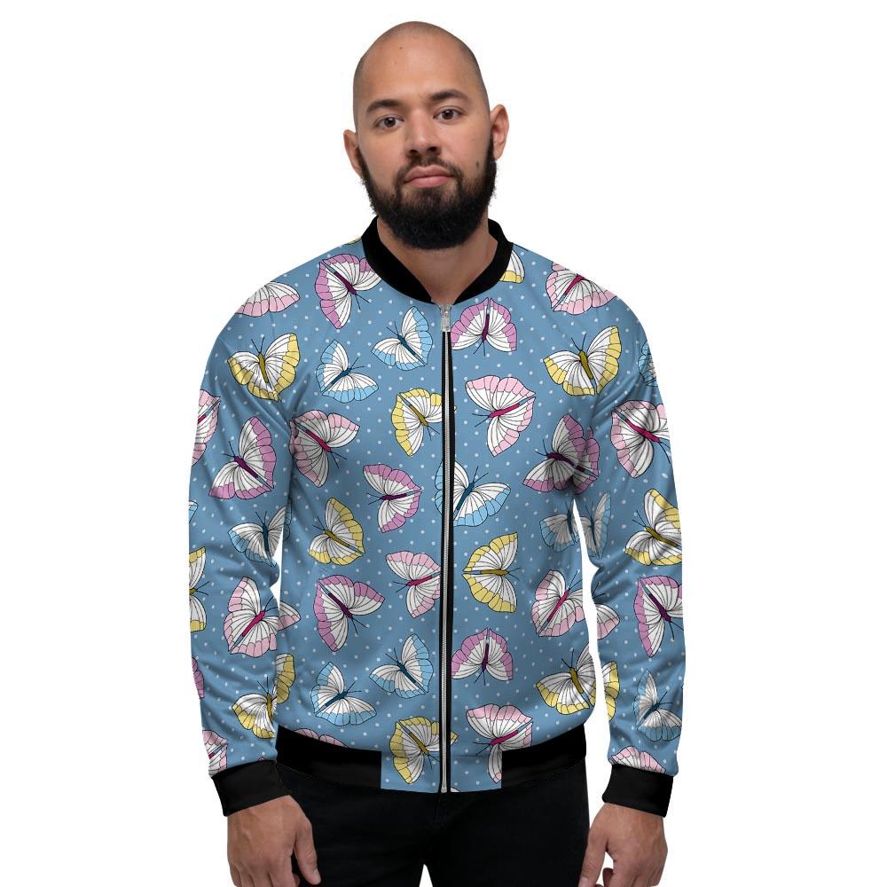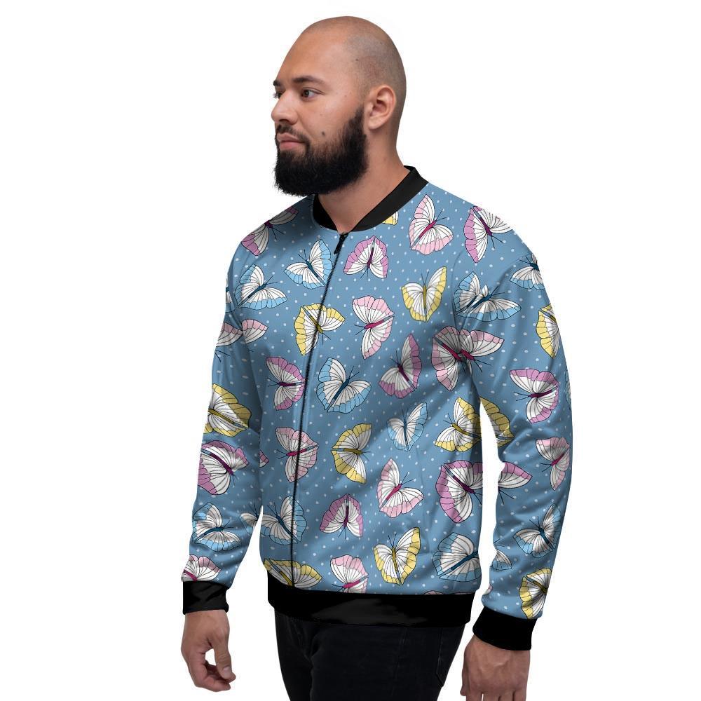 Blue Polka Dots Butterfly Print Men's Bomber Jacket-grizzshopBlue Polka Dots Butterfly Print Men's Bomber Jacket-grizzshop