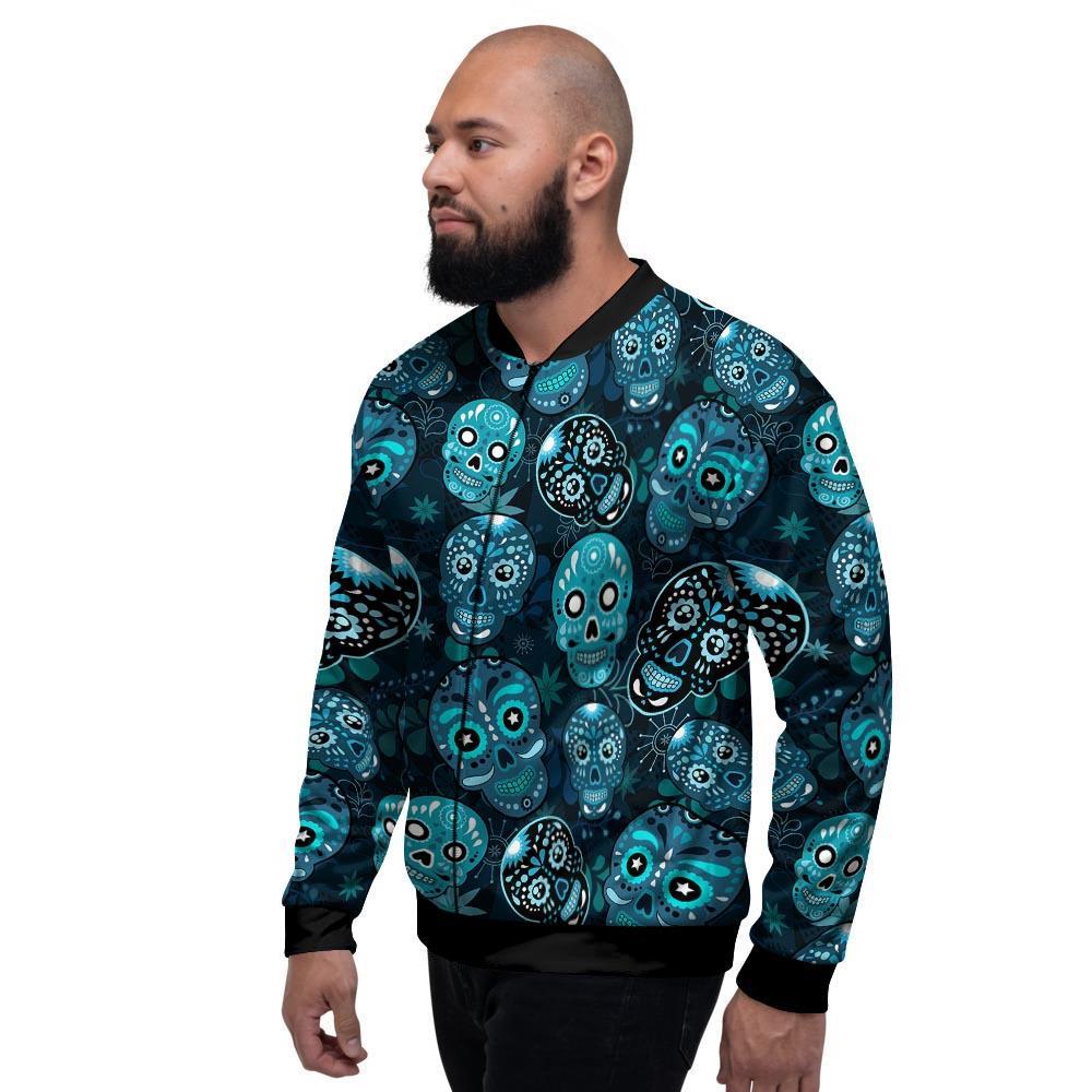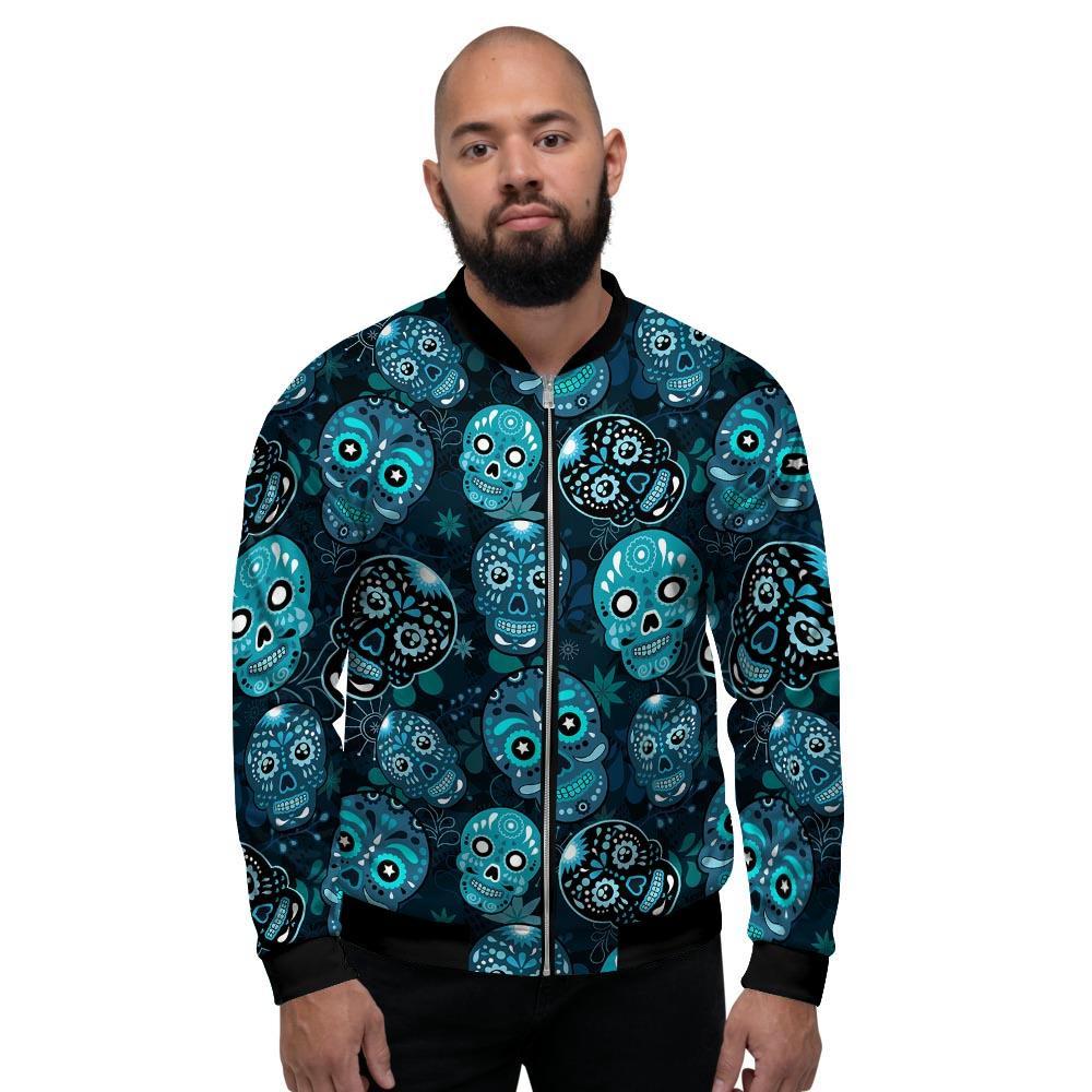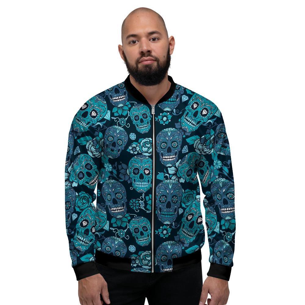 Blue Sugar Skull Print Men's Bomber Jacket-grizzshopBlue Sugar Skull Print Men's Bomber Jacket-grizzshop