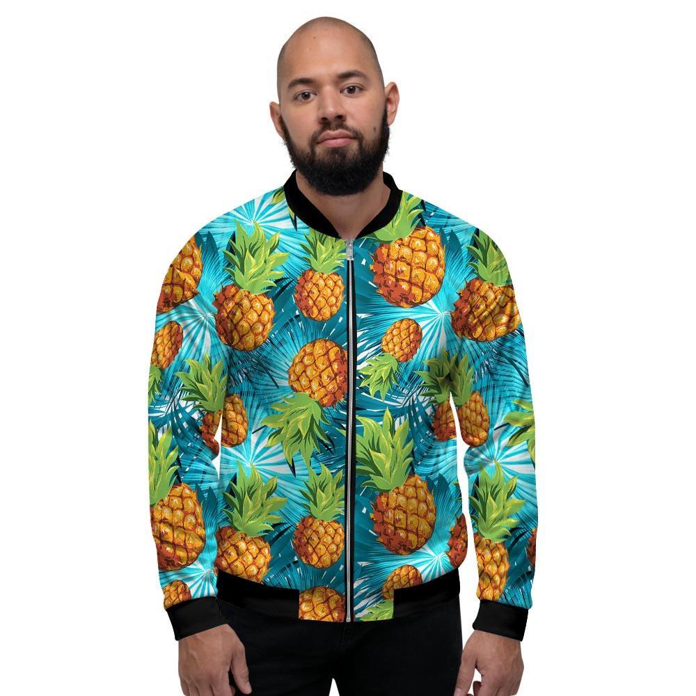 Blue Tropical Hawaiian Pineapple Print Men's Bomber Jacket-grizzshopBlue Tropical Hawaiian Pineapple Print Men's Bomber Jacket-grizzshop