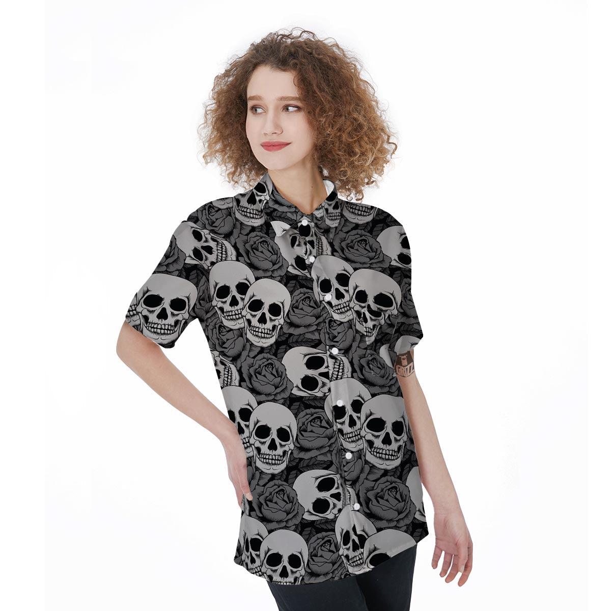 Black And White Rose Floral Skull Women's Short Sleeve Shirts-grizzshopBlack And White Rose Floral Skull Women's Short Sleeve Shirts-grizzshop