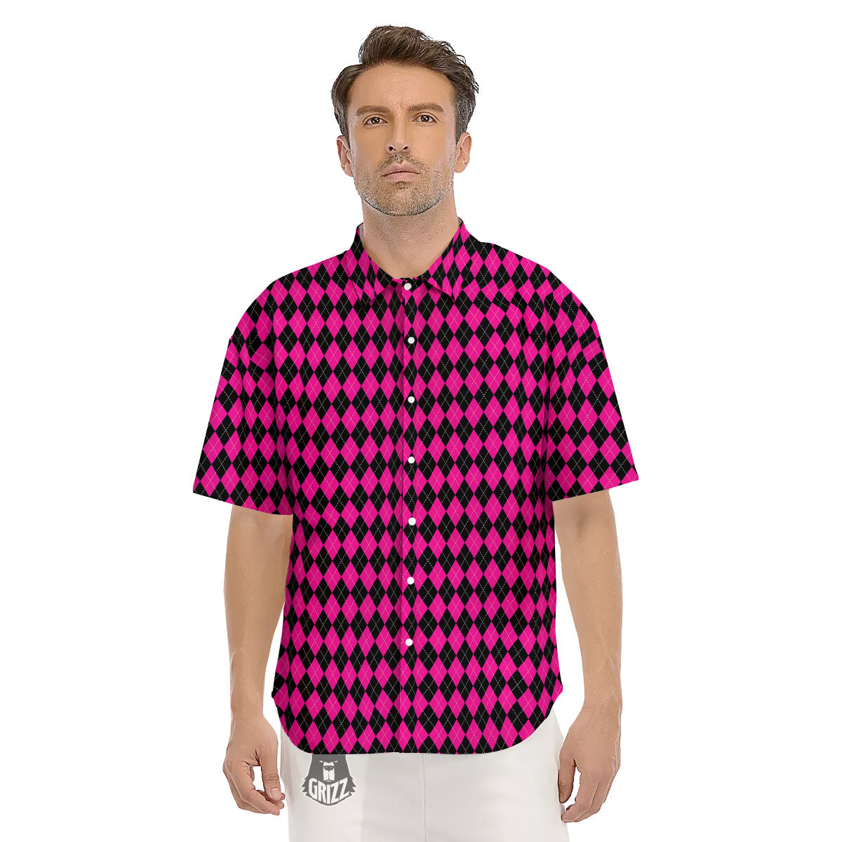 Black Argyle And Deep Pink Print Pattern Men's Short Sleeve Shirts-grizzshopBlack Argyle And Deep Pink Print Pattern Men's Short Sleeve Shirts-grizzshop
