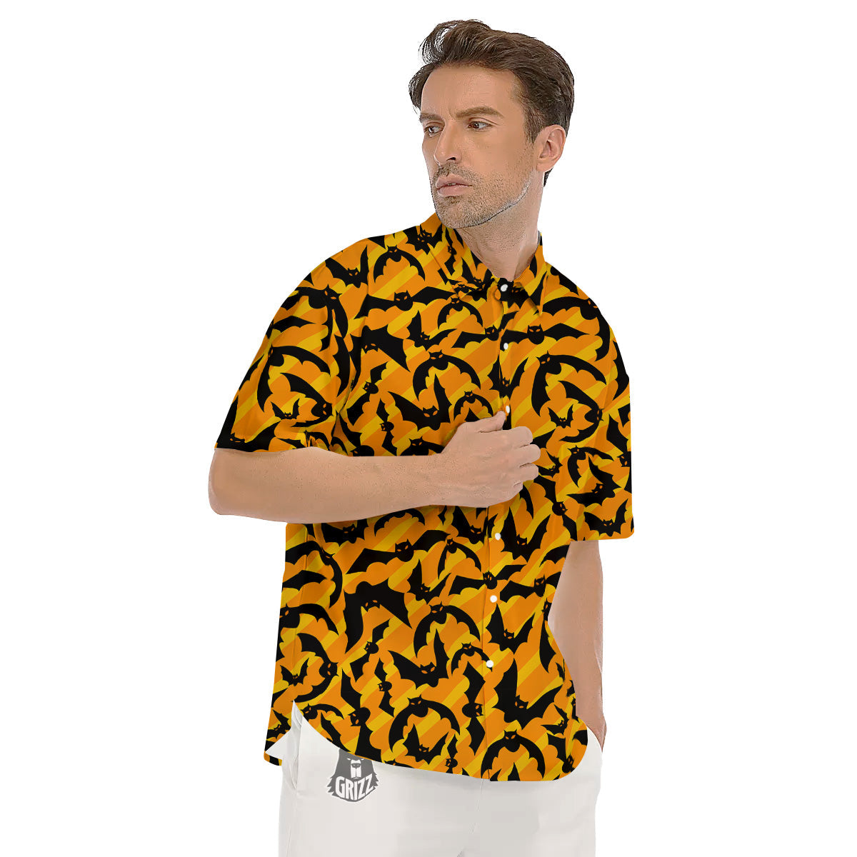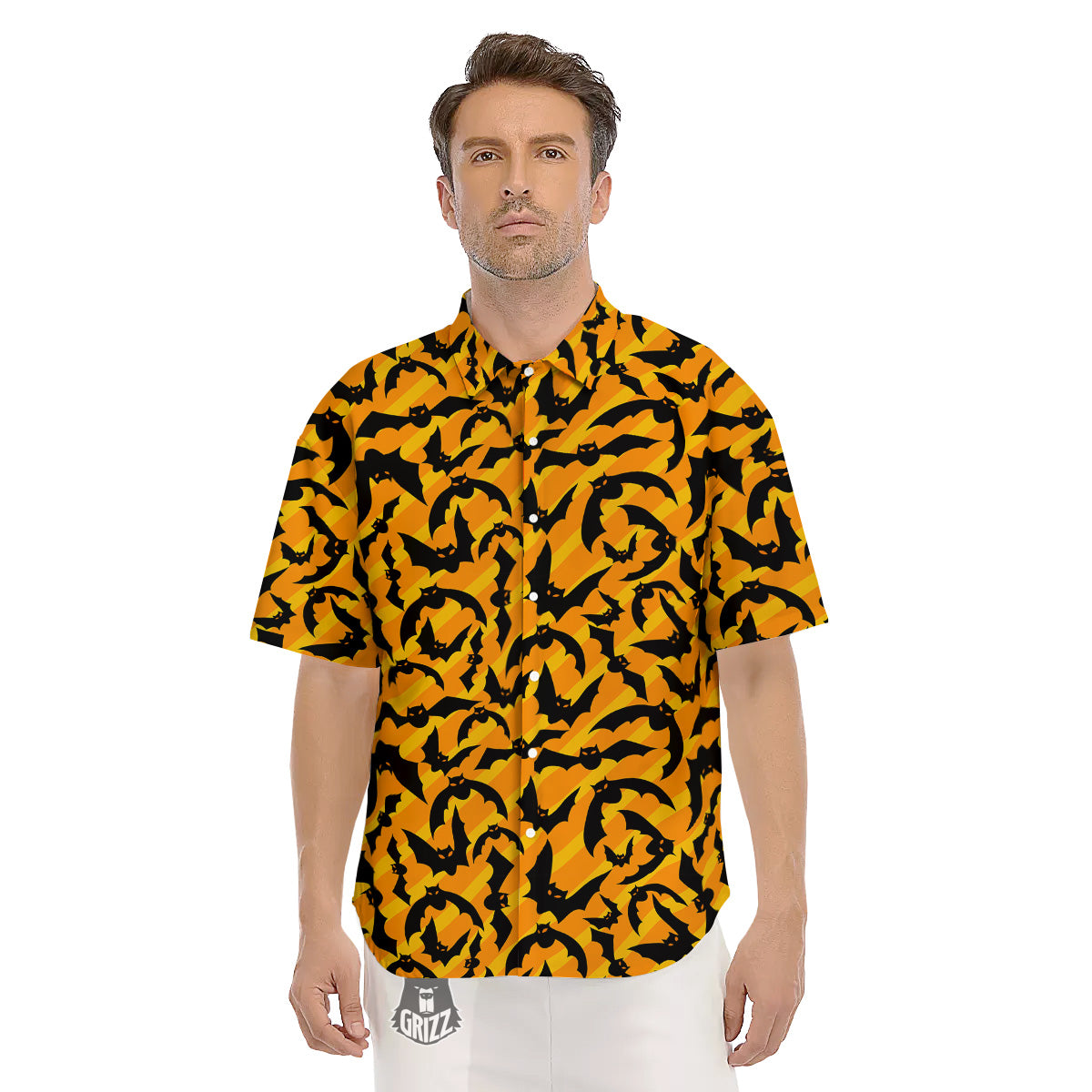 Black Bat And Orange Striped Print Pattern Men's Short Sleeve Shirts-grizzshopBlack Bat And Orange Striped Print Pattern Men's Short Sleeve Shirts-grizzshop