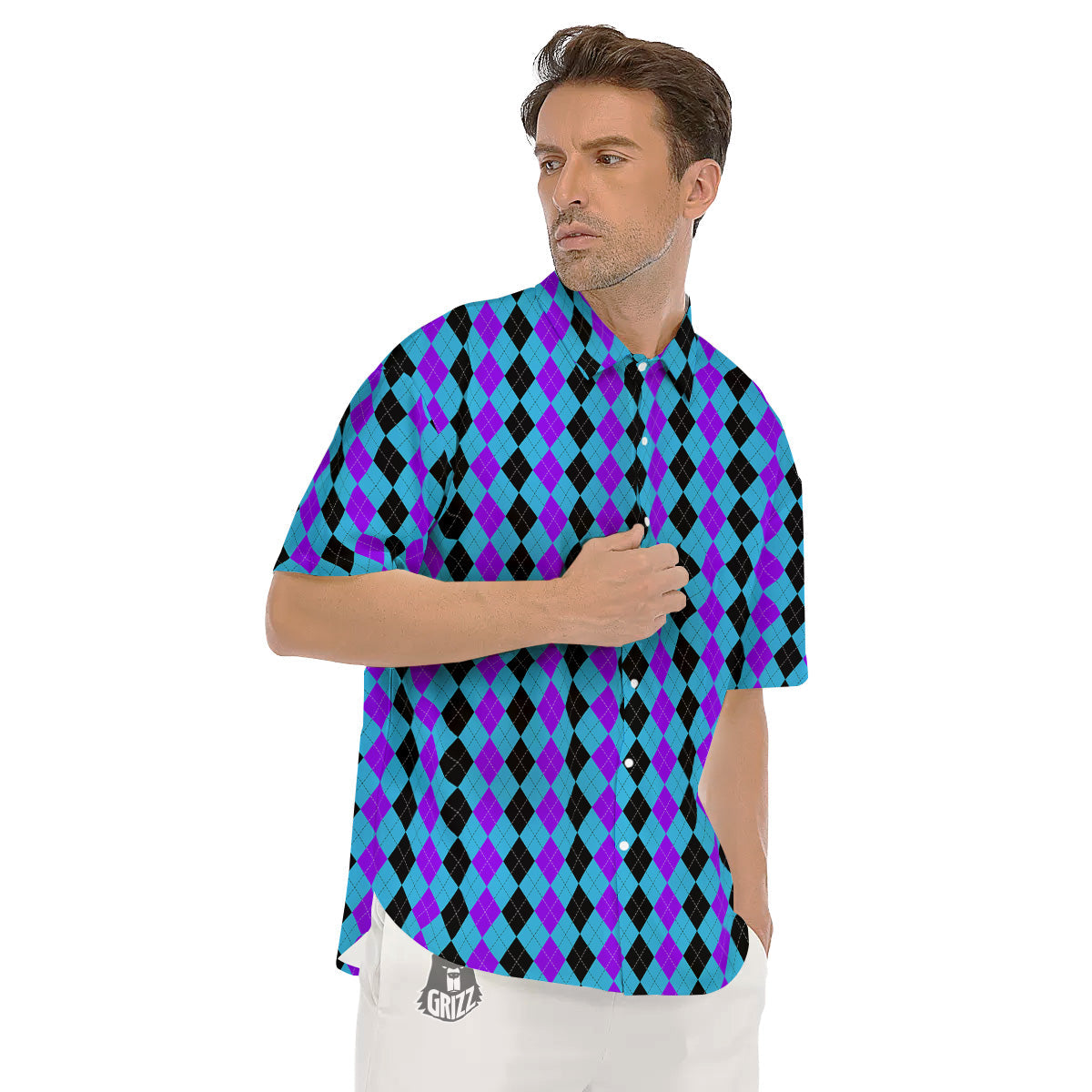 Black Blue And Purple Argyle Print Men's Short Sleeve Shirts-grizzshopBlack Blue And Purple Argyle Print Men's Short Sleeve Shirts-grizzshop