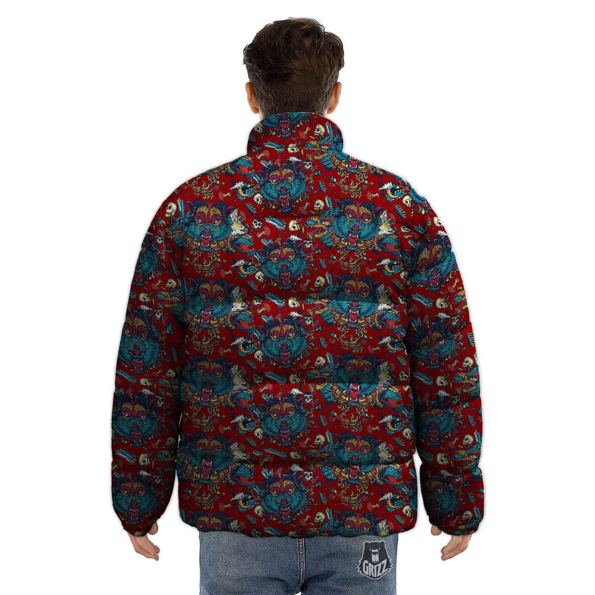 Abstract Wolf Fairy Tale Tattoo Print Pattern Puffer Jacket