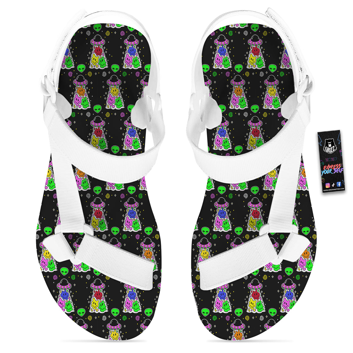 Alien And UFO Trippy Print Pattern White Open Toe Sandals
