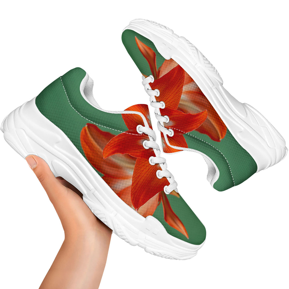 Looking for unique chunky shoes? Check out our Amaryllis Orange Print White Chunky Shoes at Grizzshopping. Our chunky shoes are handcrafted to the highest quality standards that custom made for you
