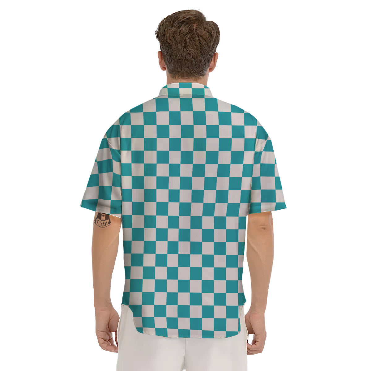 Aqua Checkered Flag Print Men's Short Sleeve Shirts