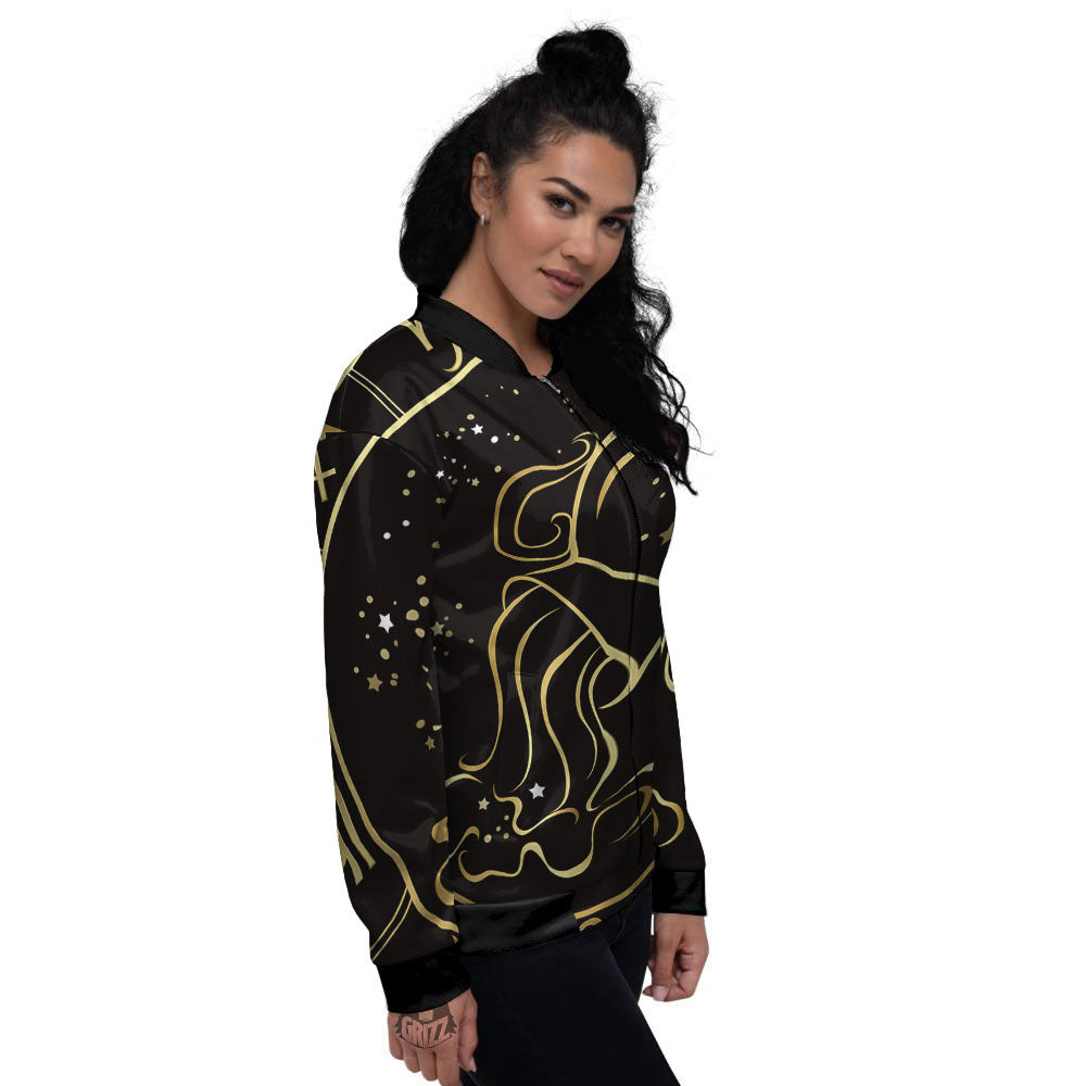 Aquarius Sign Black And Gold Print Women's Bomber Jacket