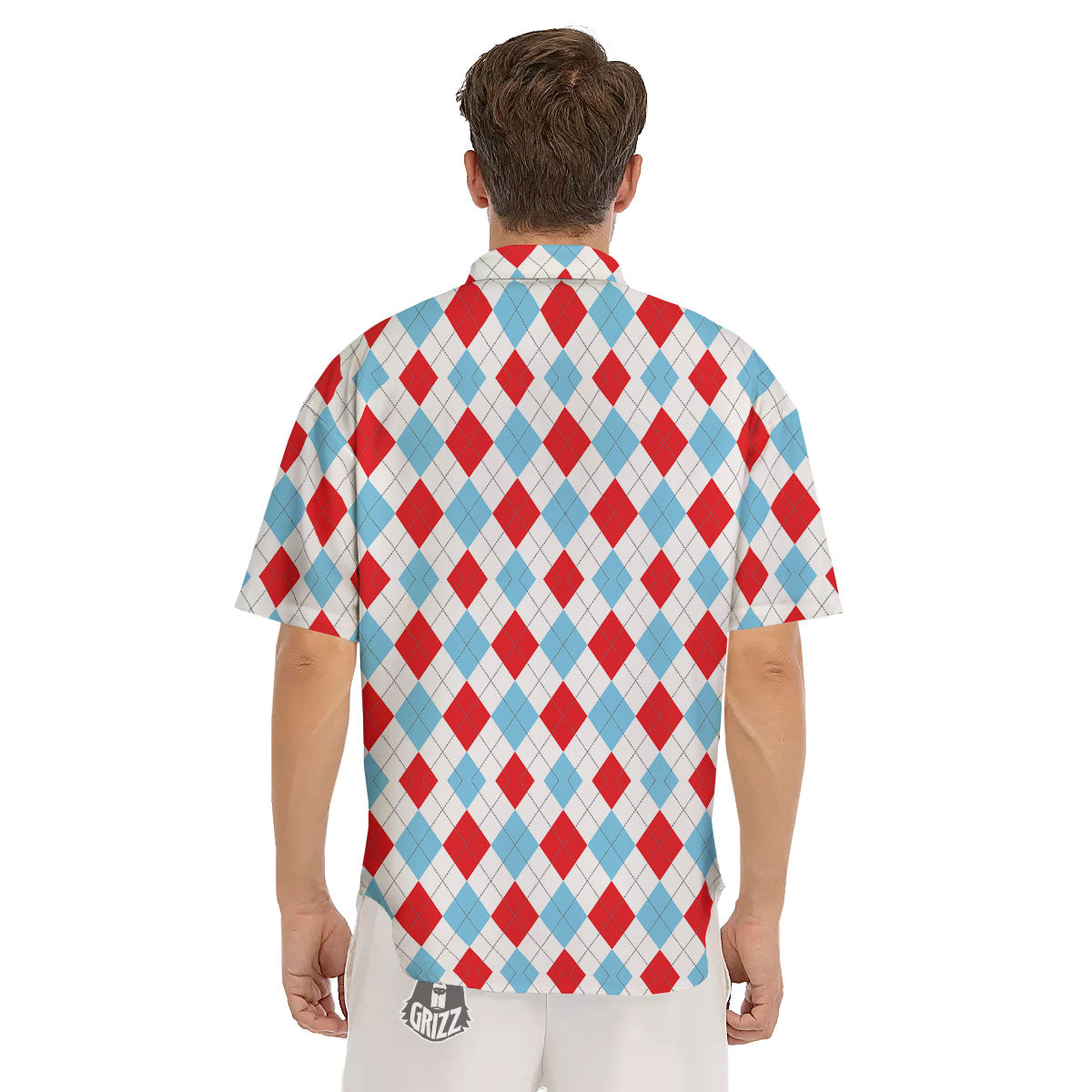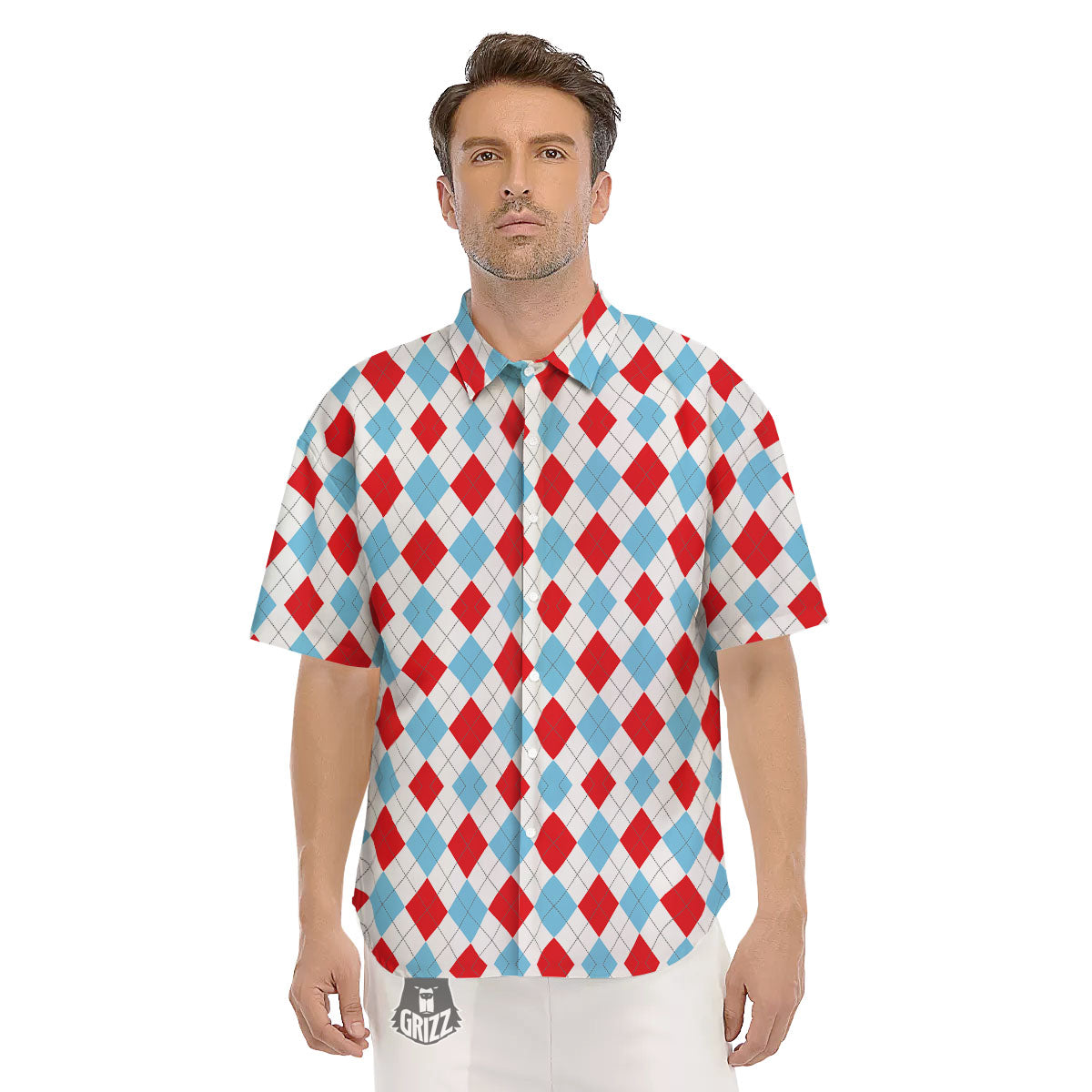Argyle Blue And Red Print Pattern Men's Short Sleeve Shirts
