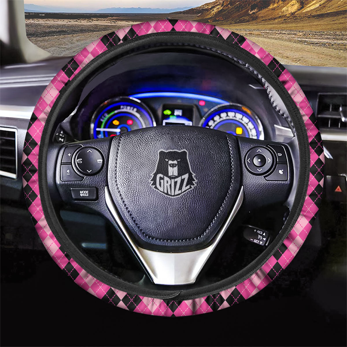 Argyle Pink And Black Print Pattern Car Steering Wheel Cover