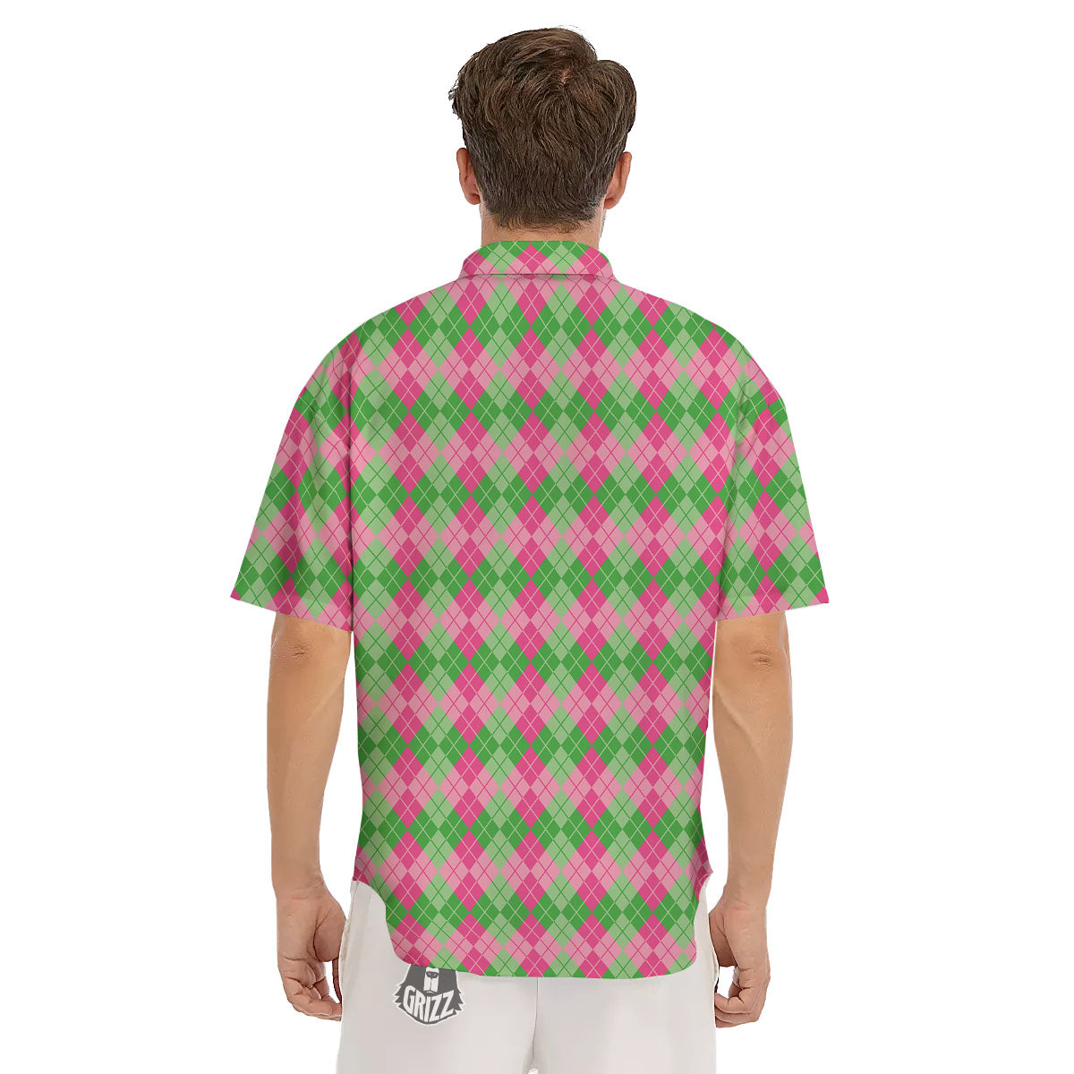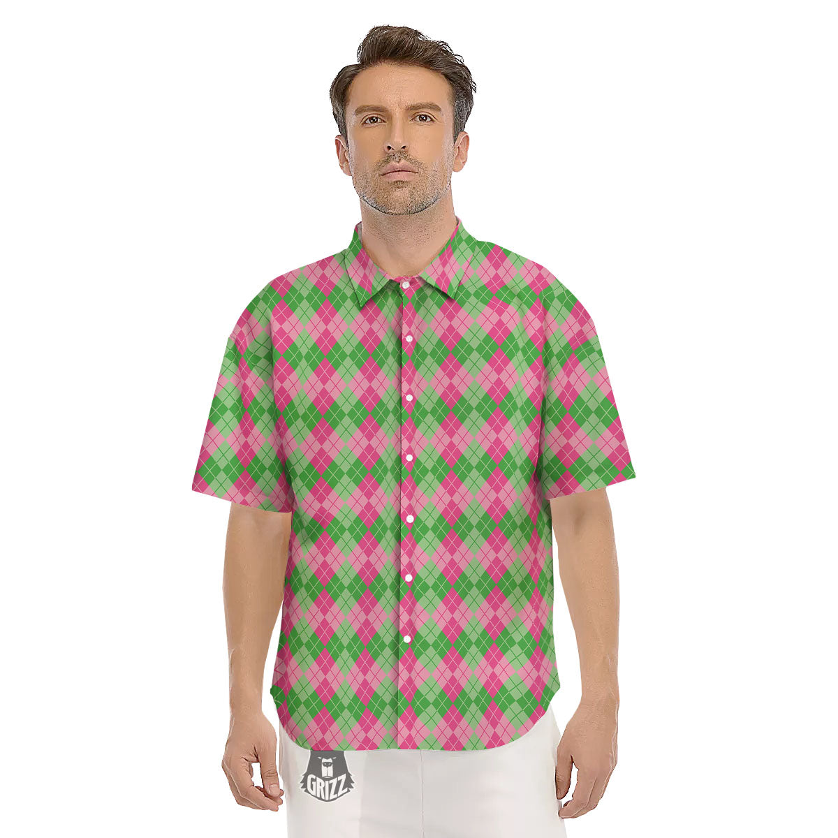 Argyle Pink And Green Print Pattern Men's Short Sleeve Shirts
