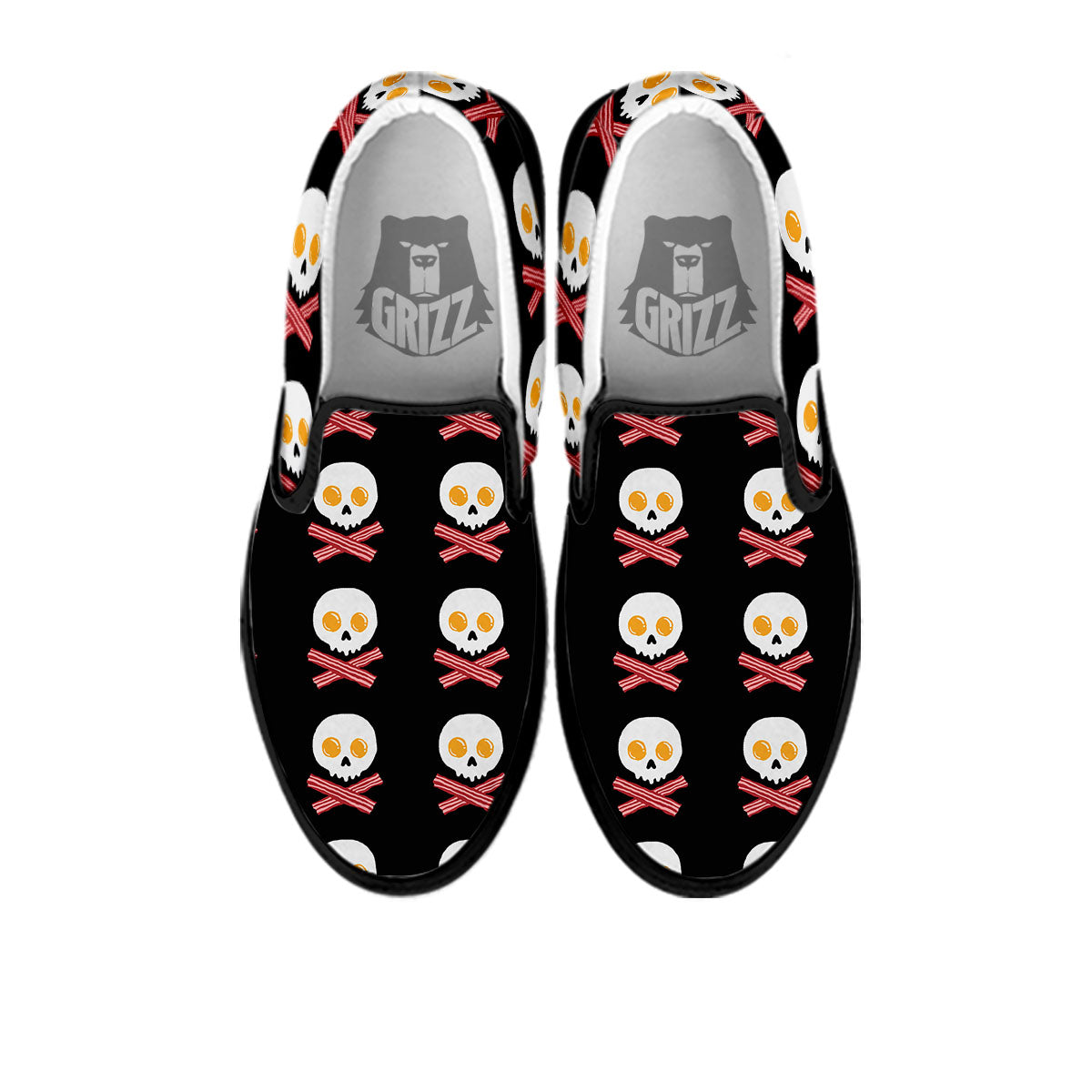 Bacon And Skull Fried Egg Print Pattern Black Slip On Shoes
