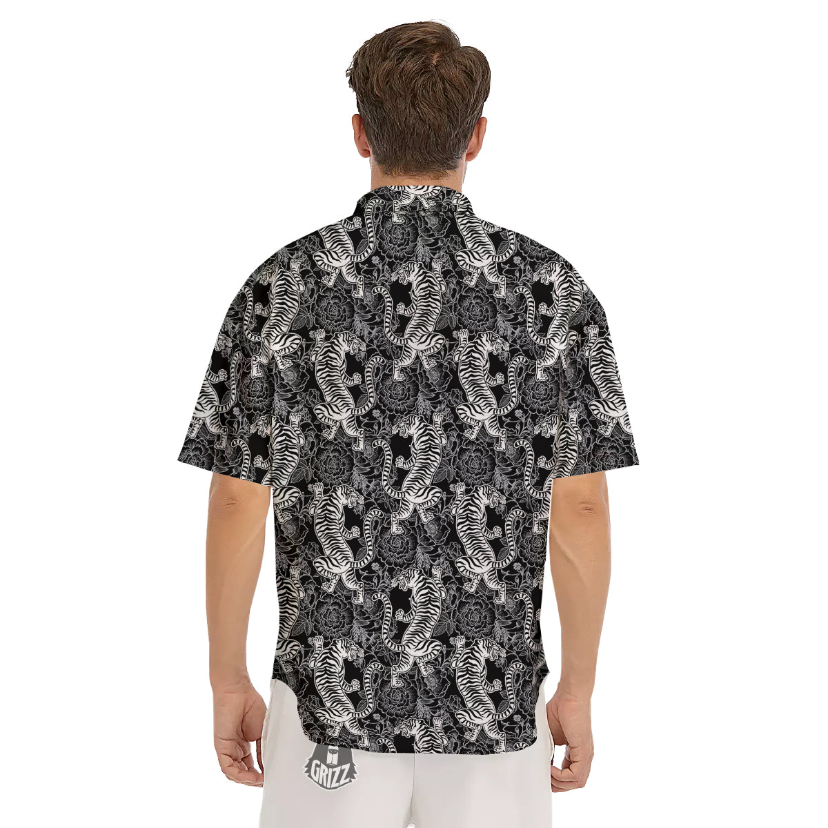 Black And White Chinese Tiger Print Pattern Men's Short Sleeve Shirts
