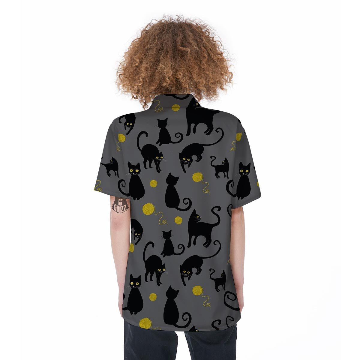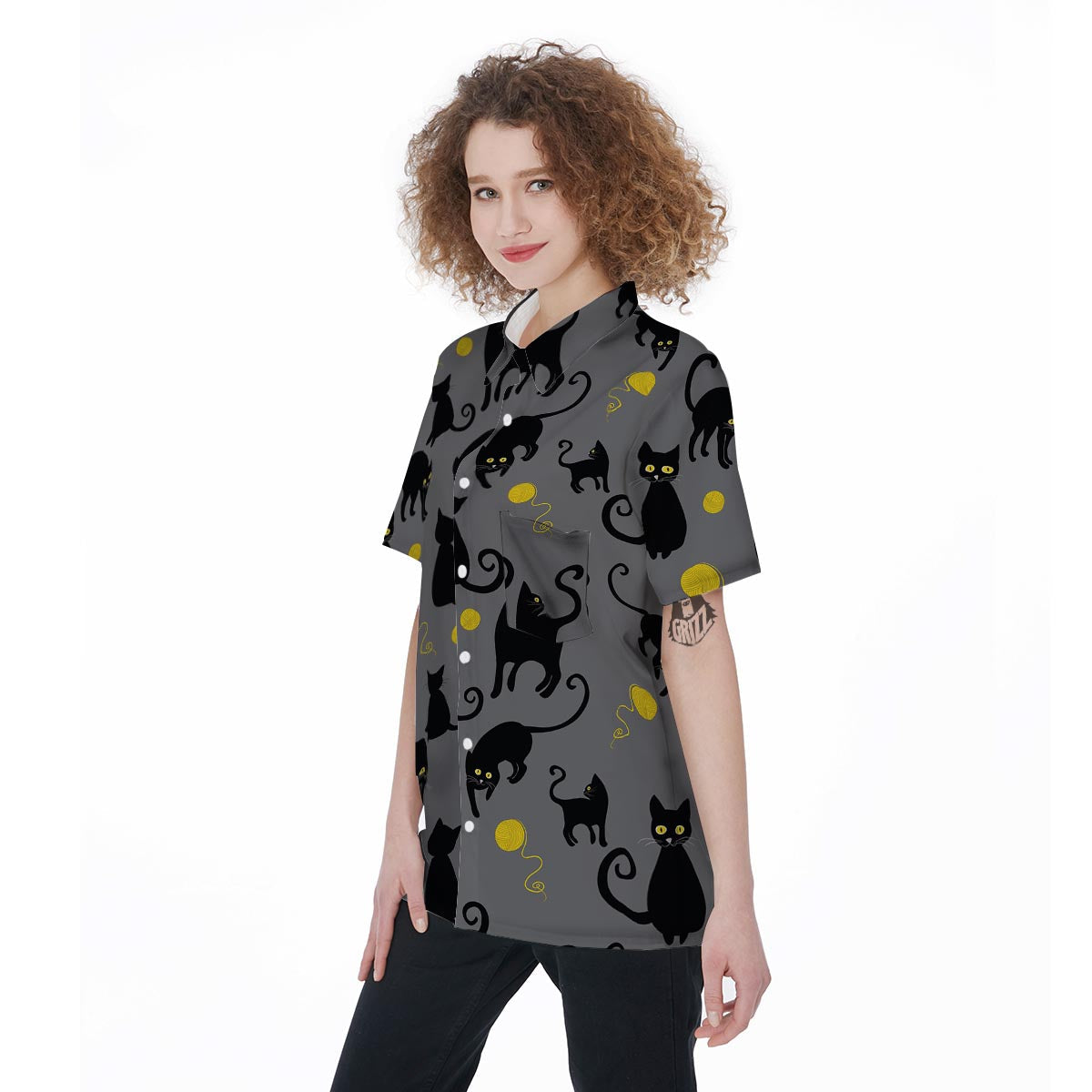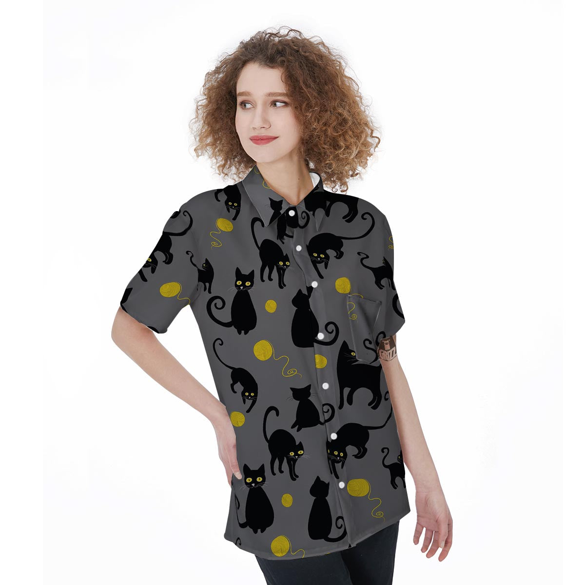 Black Cat Knit Print Women's Short Sleeve Shirts