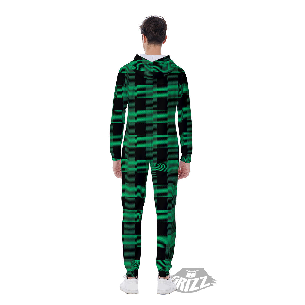 Black Green Buffalo Check And UFO Print Pattern Men's Jumpsuit