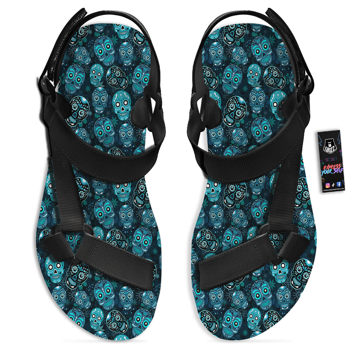 Blue Calavera Skull Print Pattern Black Open Toe Sandals