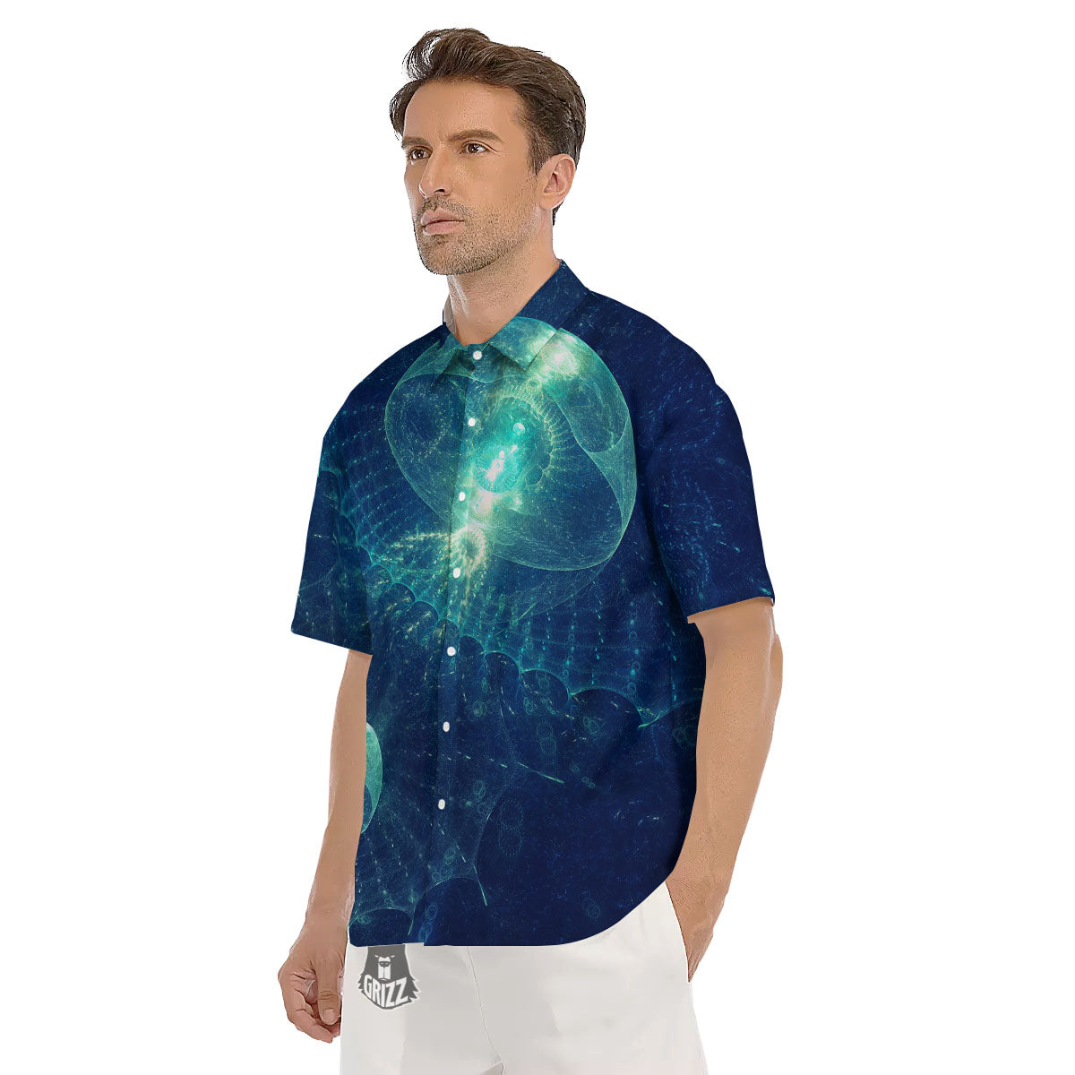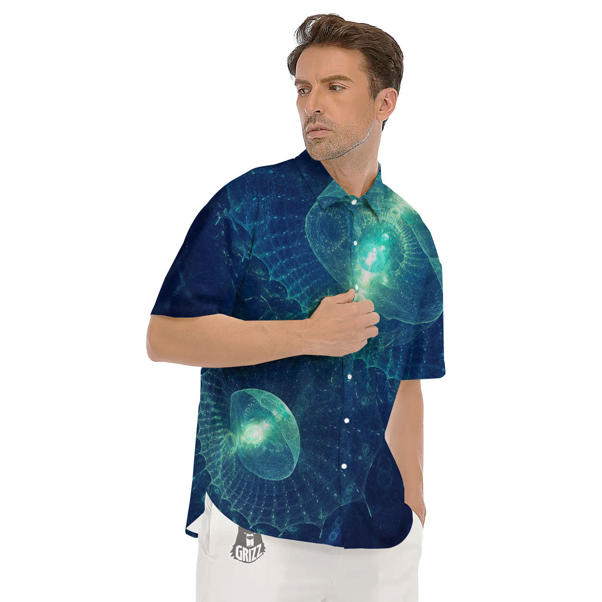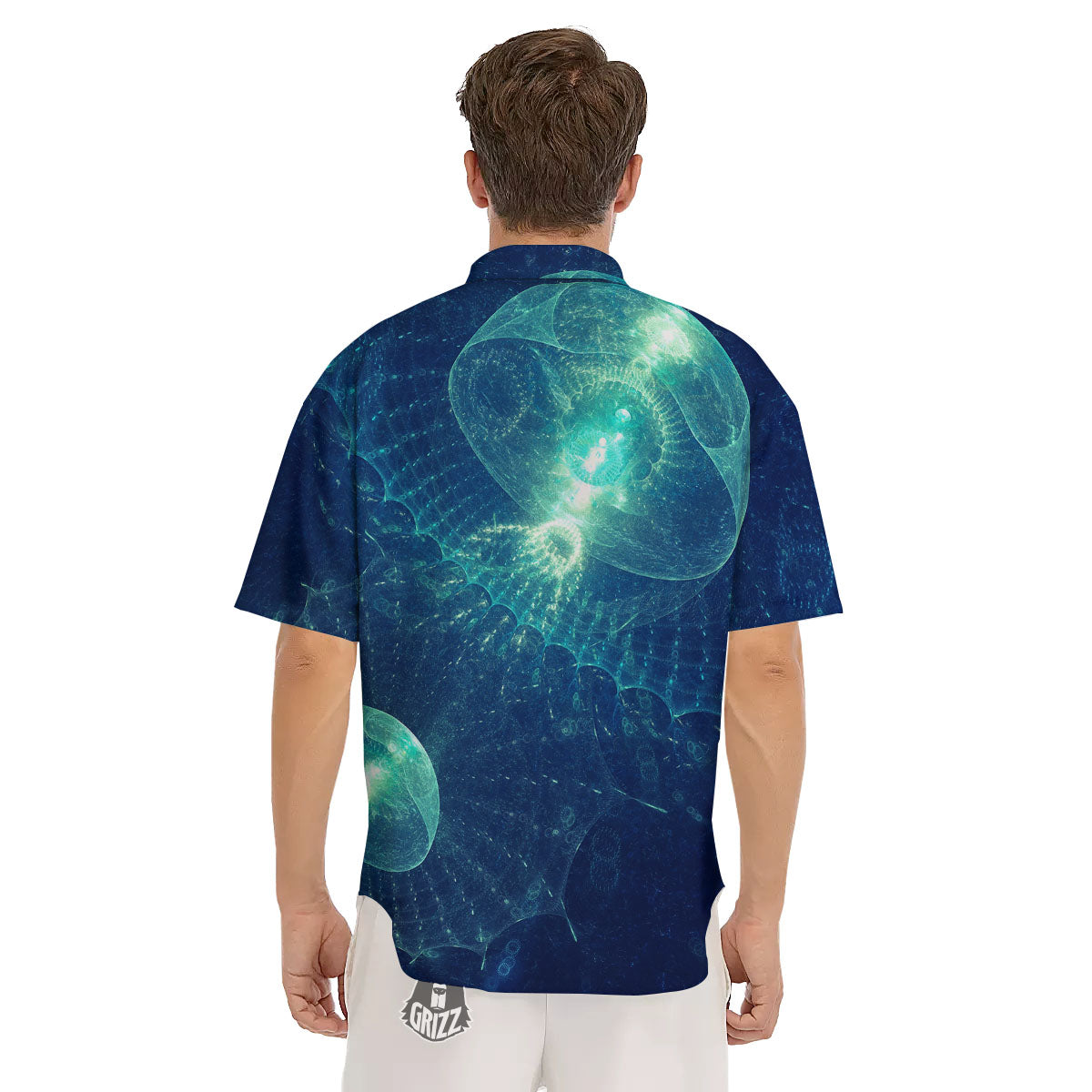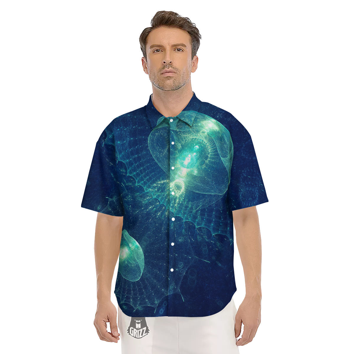 Blue Jellyfish On Deep Sea Print Men's Short Sleeve Shirts
