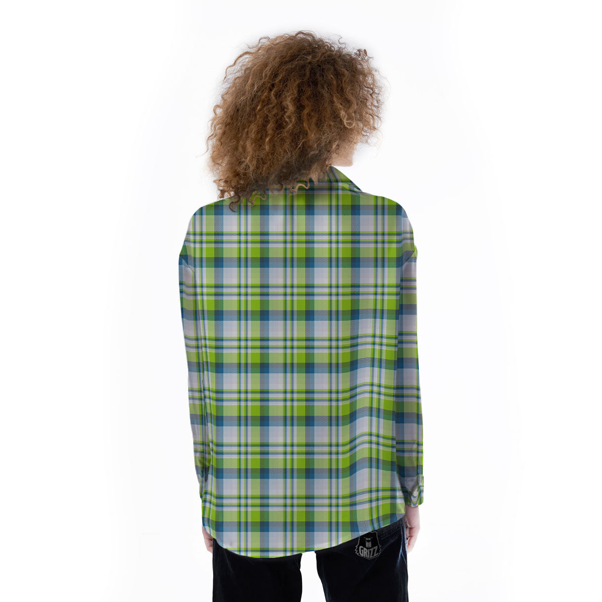 Blue Madras Plaid And Lime Print Pattern Women's Long Sleeve Shirts
