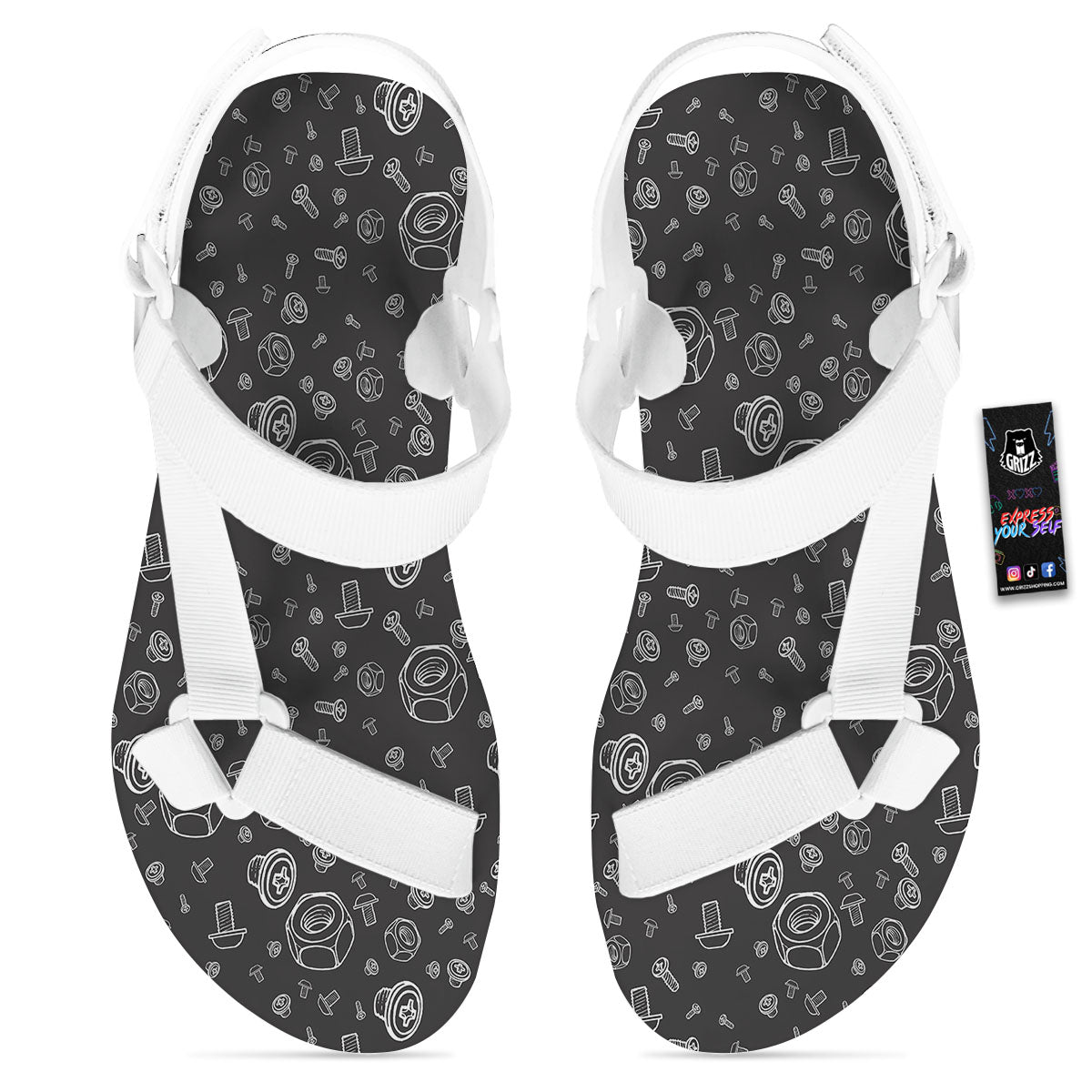 Bolts and Mechanic Nuts Print Pattern White Open Toe Sandals