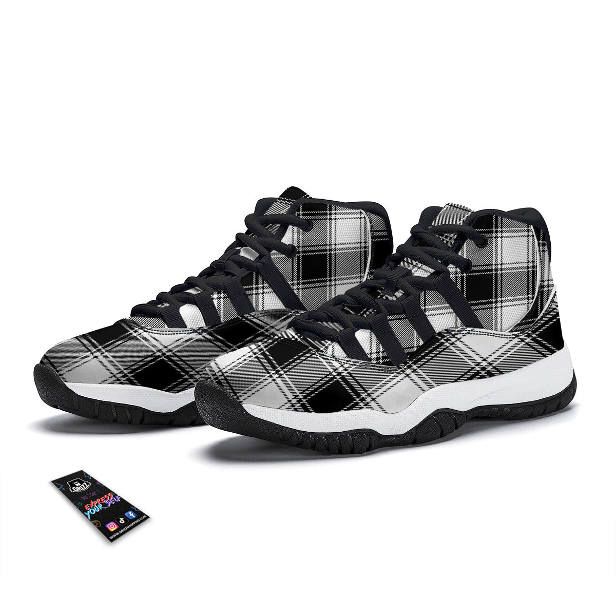 Border Tartan White And Black Print Pattern Black Bball Shoes