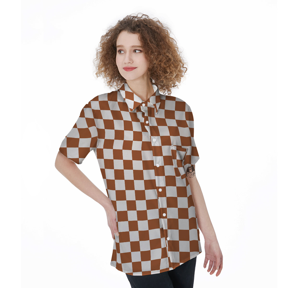 Bronze Checkered Flag Print Women's Short Sleeve Shirts
