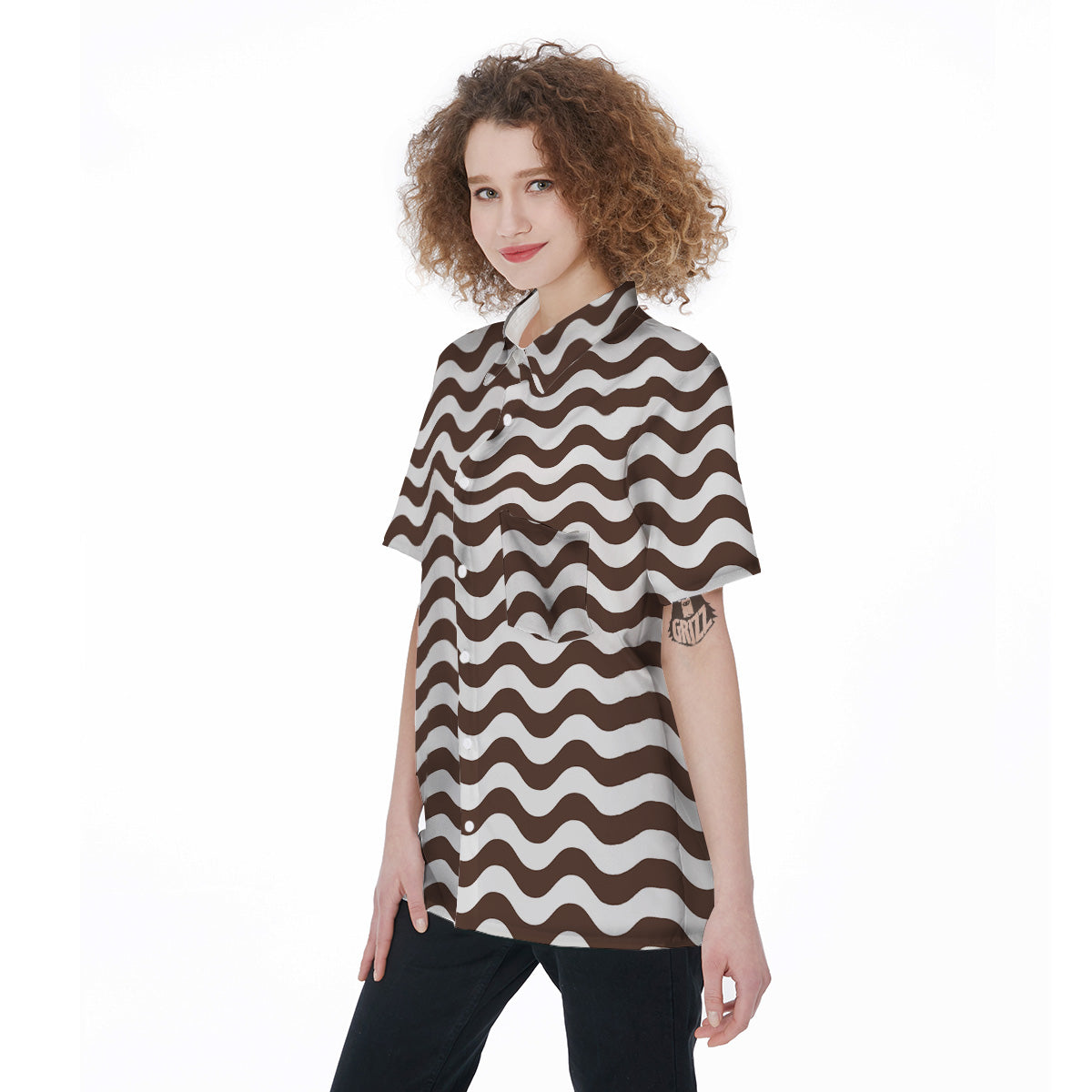 Brown Wave Striped Print Women's Short Sleeve Shirts