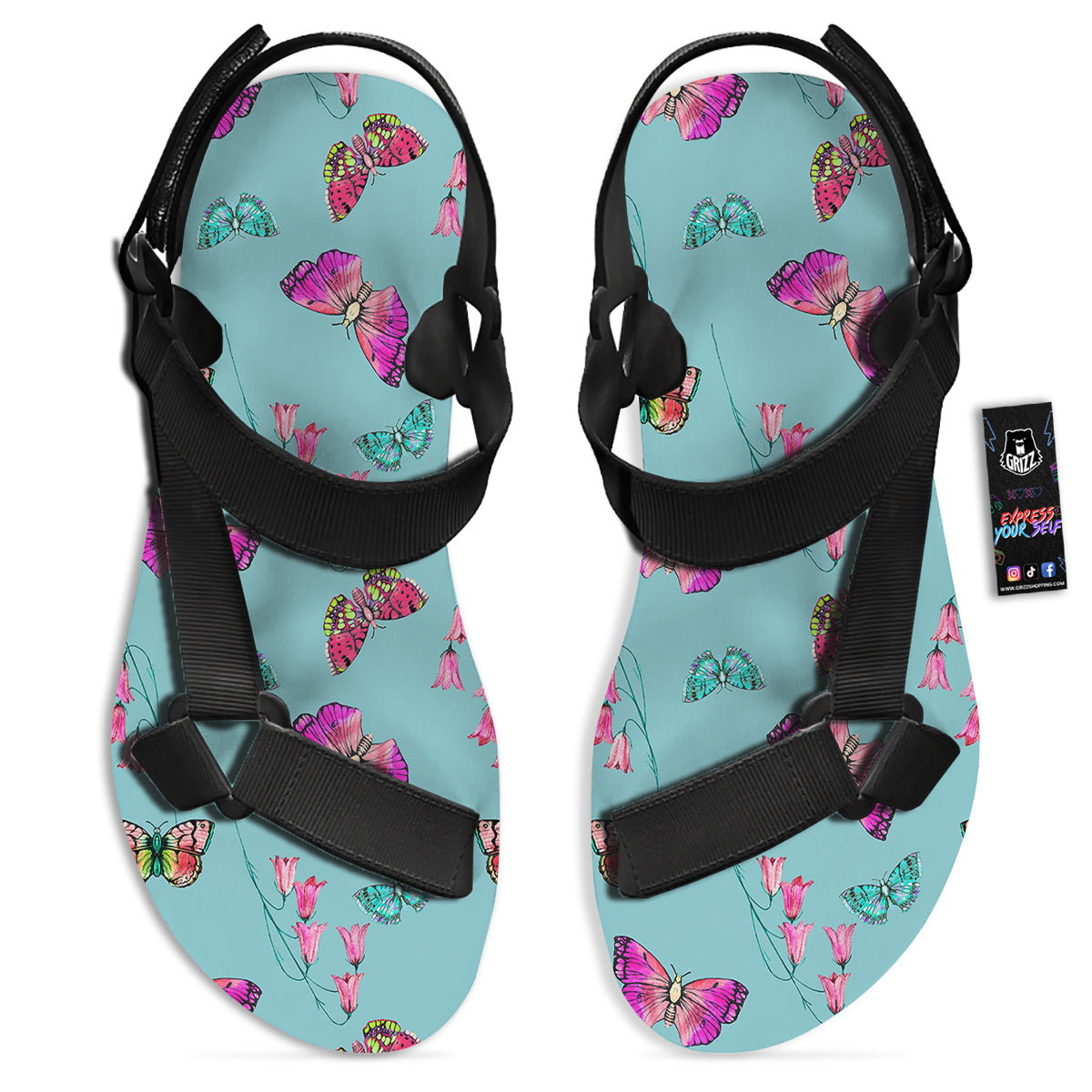 Butterfly Pink And Turquoise Print Pattern Black Open Toe Sandals