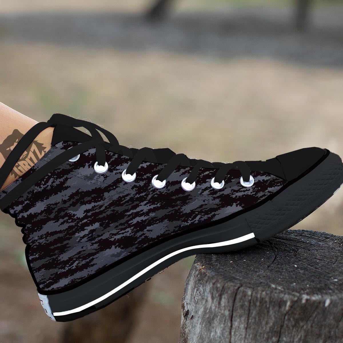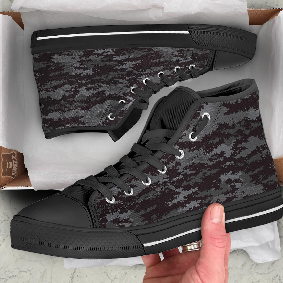 Looking for a unique shoes? Check out our Camo Black Tan Digital Print Pattern Black High Top Shoes at Grizzshopping. Our shoes are handcrafted to the highest quality standards that custom made for you