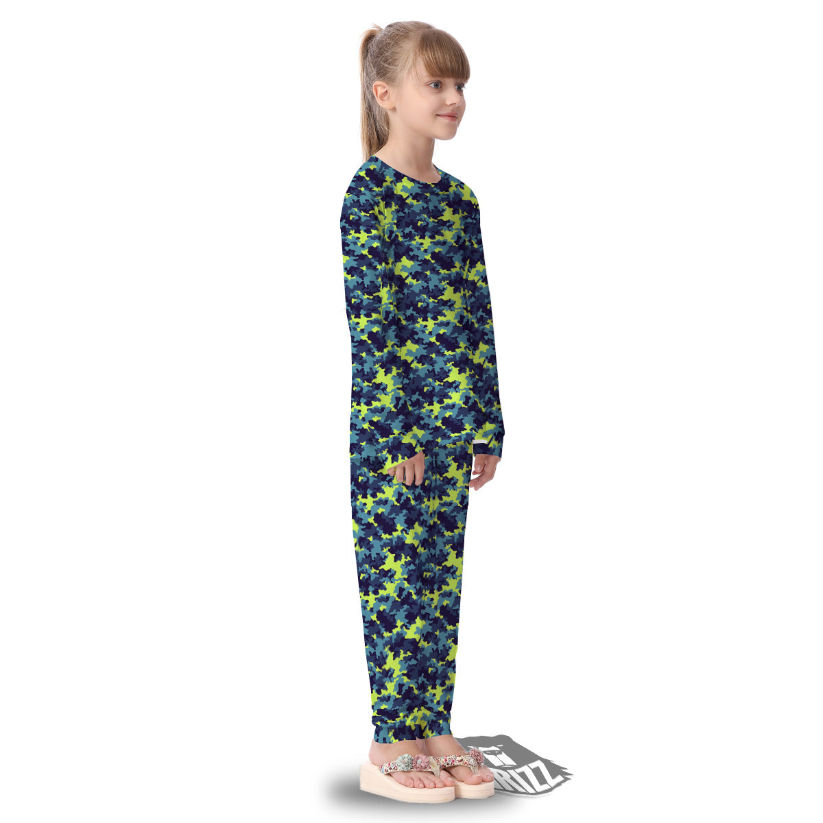 Camouflage Blue And Neon Green Print Pattern Kid's Pajamas