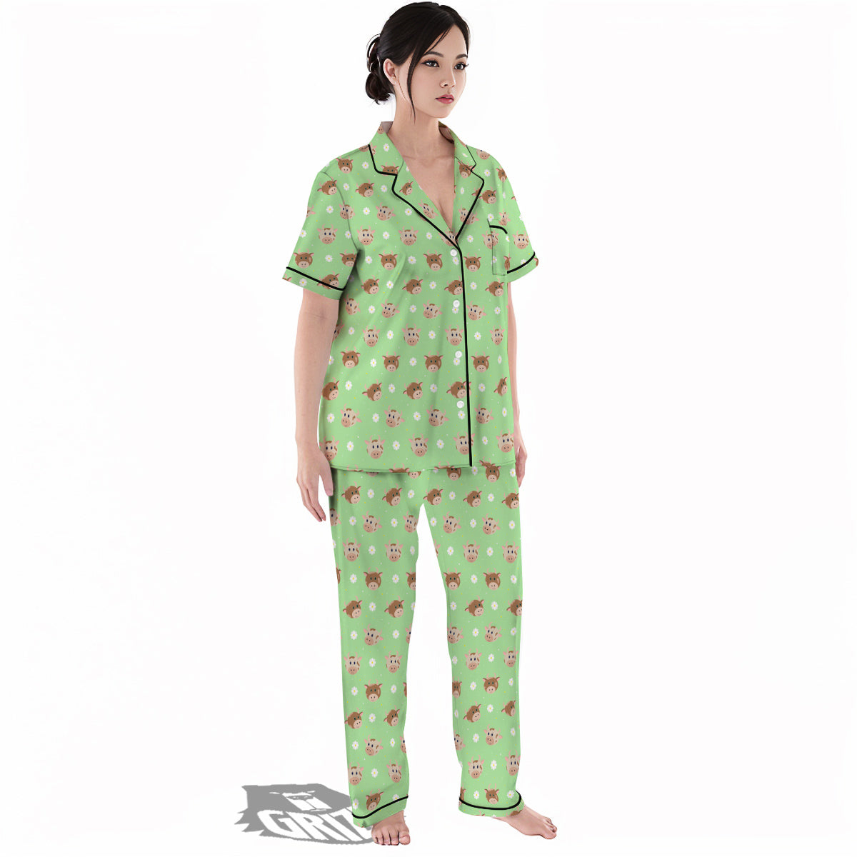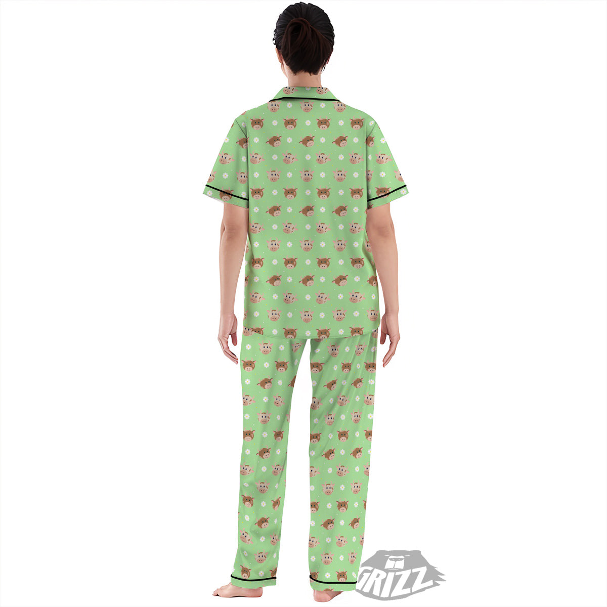 Cow Cartoon And Daisy Flower Print Women's Pajamas Set