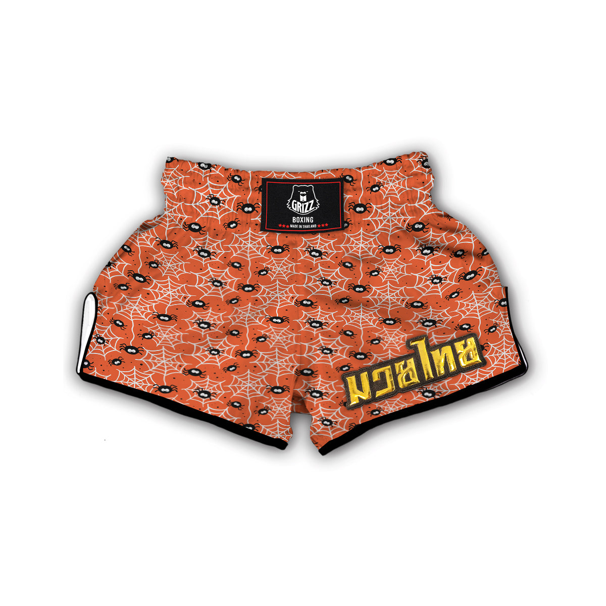 Cute Black Spider And Spider Web Orange Print Pattern Muay Thai Boxing Shorts