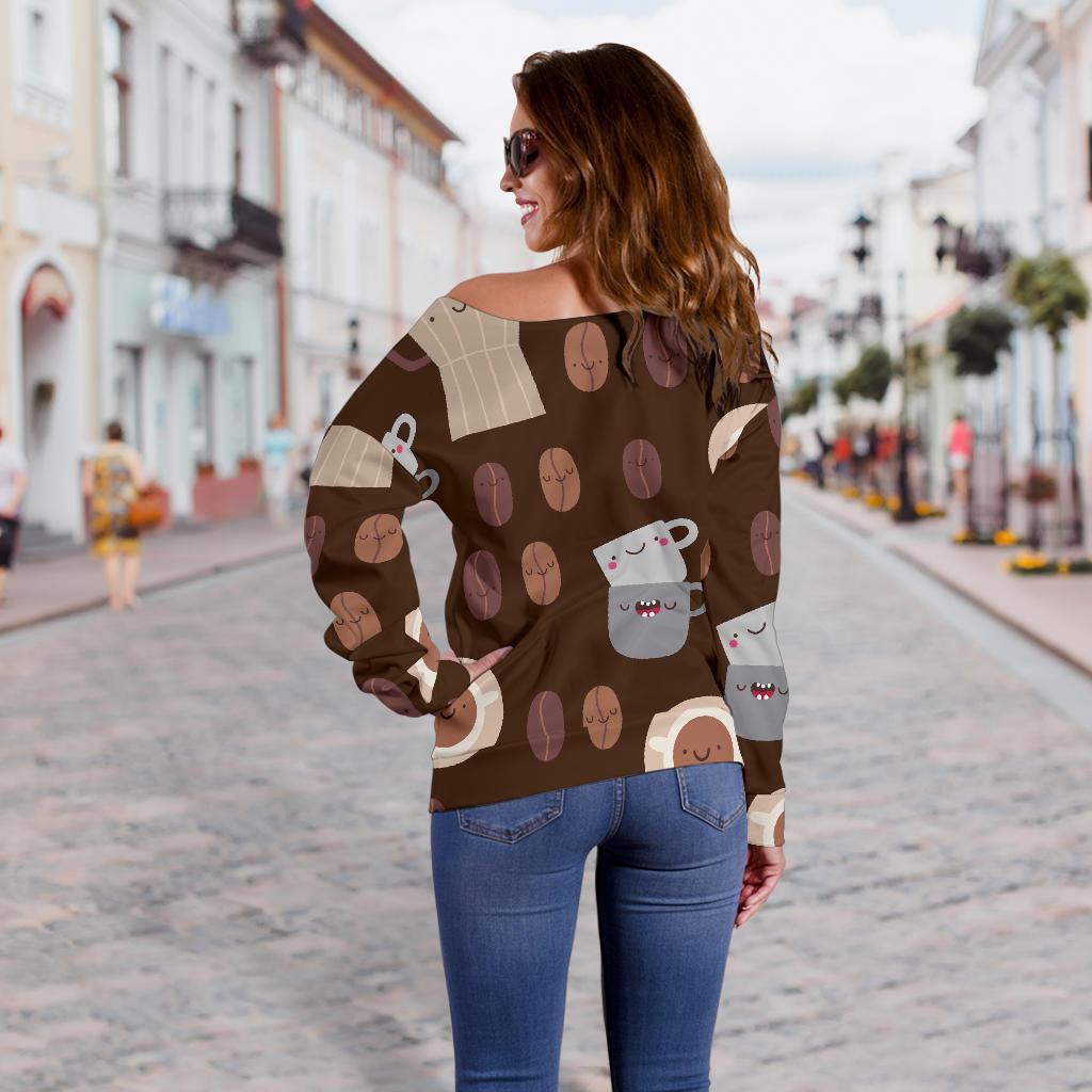 Cute Coffee Pattern Print Women Off Shoulder Sweatshirt