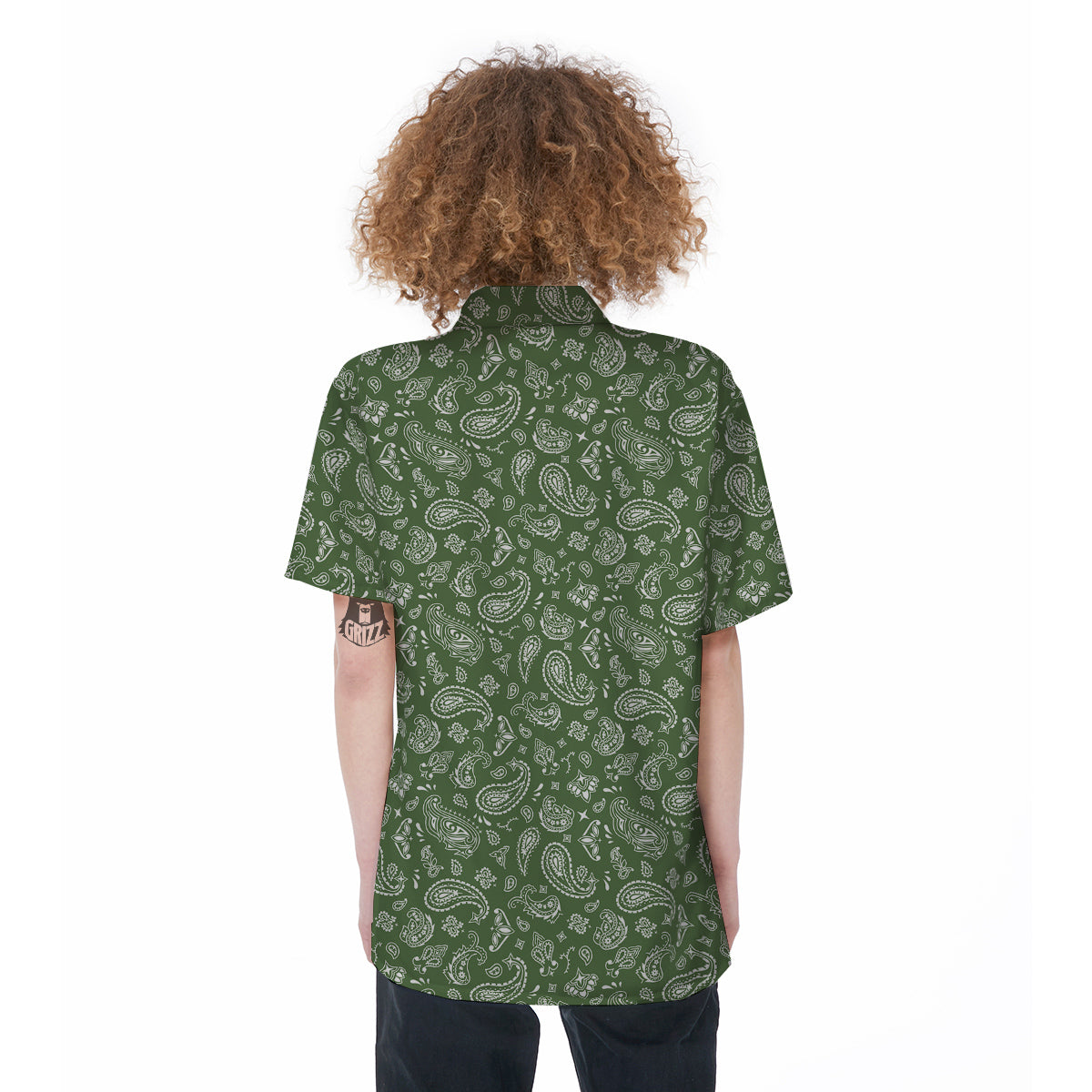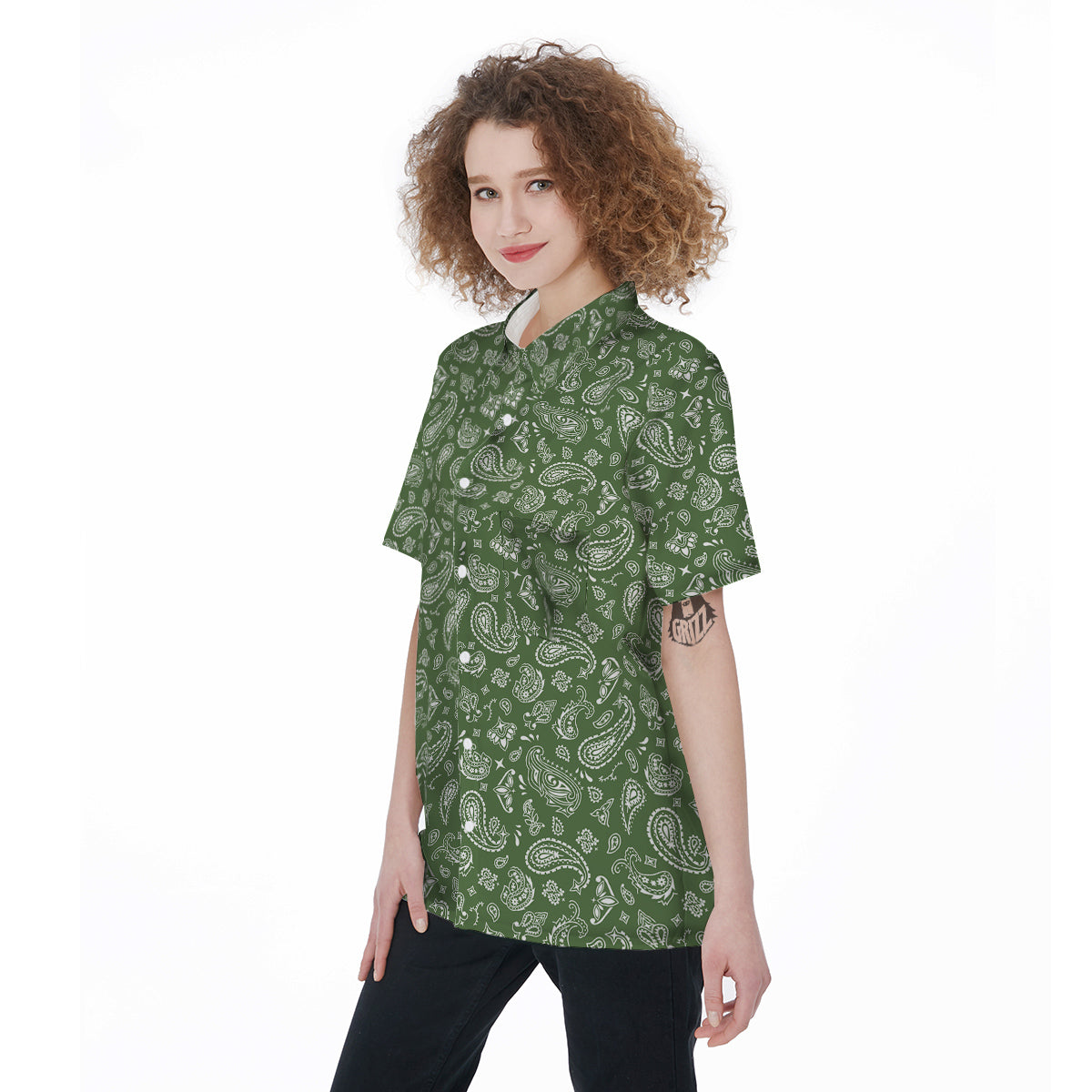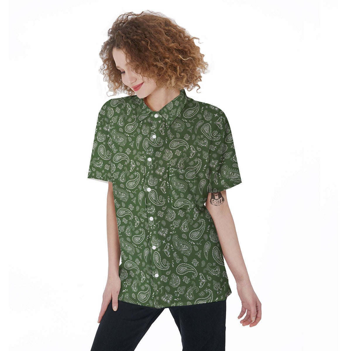 Dark Green Paisley Bandana Print Women's Short Sleeve Shirts