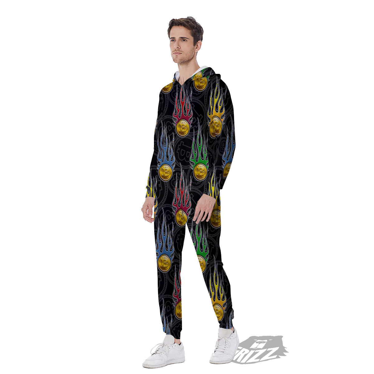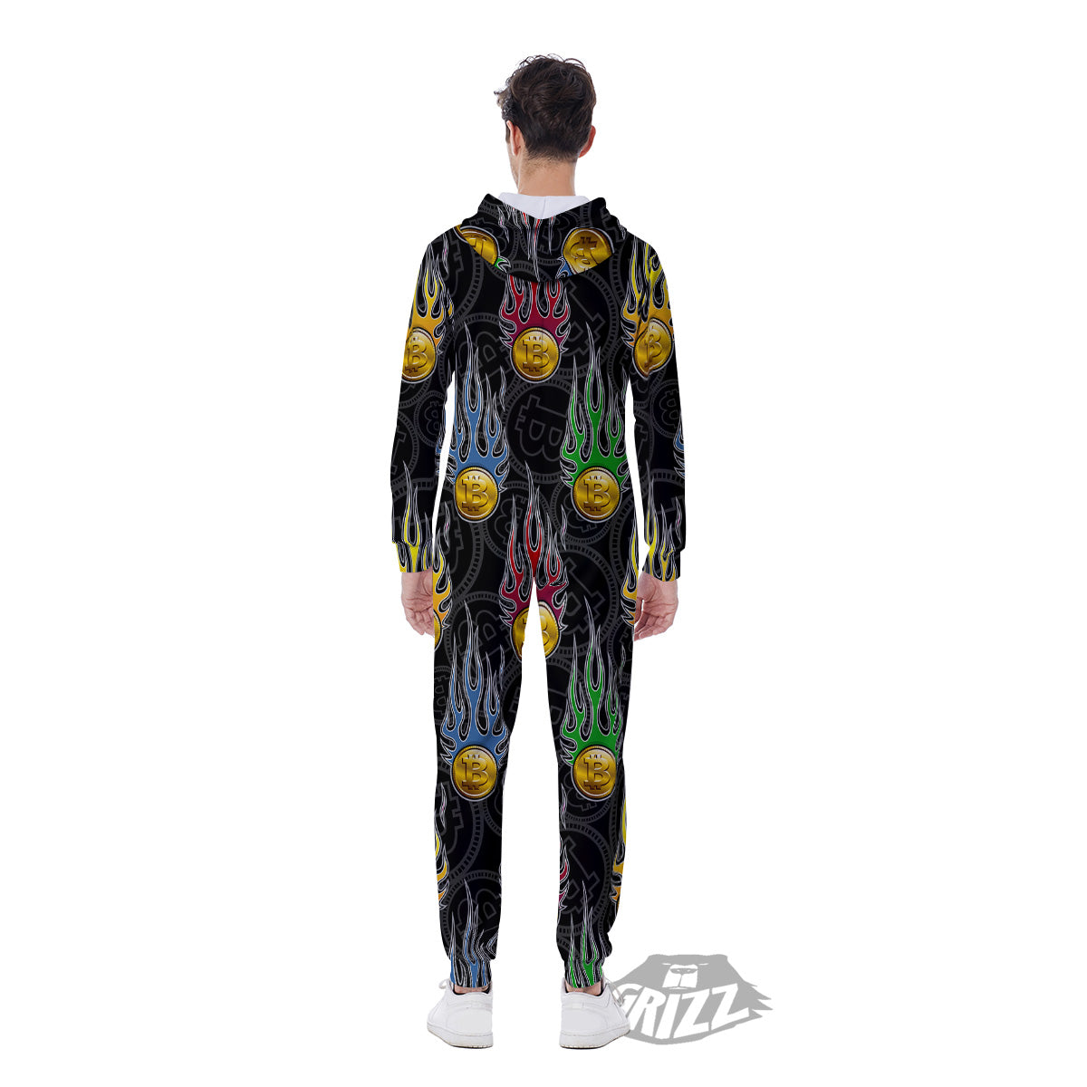 Digital Bitcoin On Fire Print Pattern Men's Jumpsuit