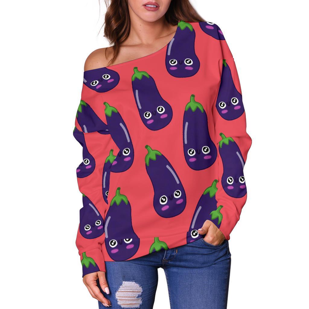 Eggplant Funny Print Pattern Women Off Shoulder Sweatshirt