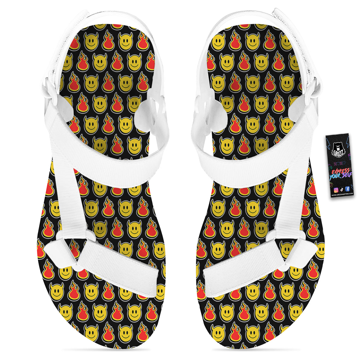 Emoji Fire And Devil Cute Print Pattern White Open Toe Sandals