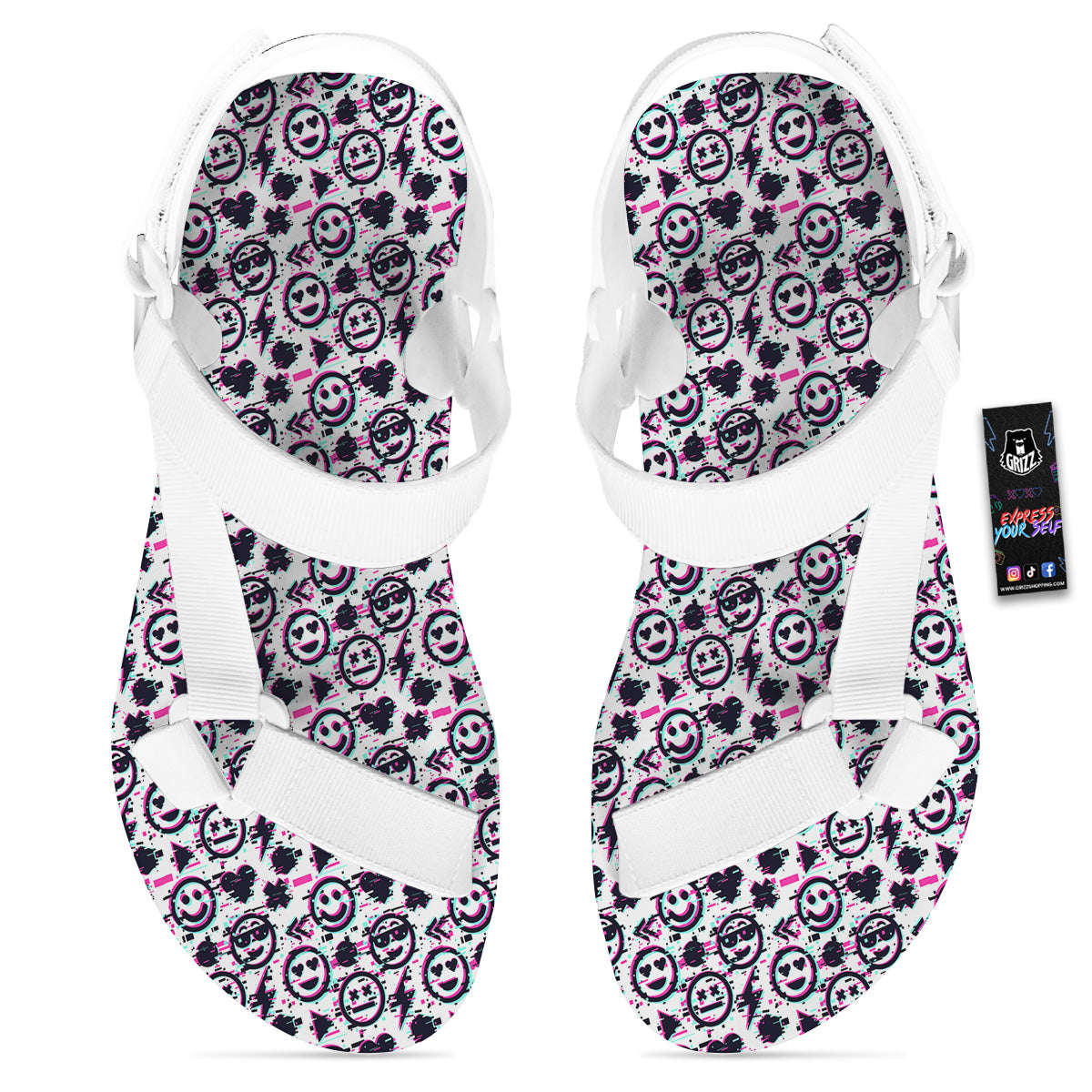 Emoji Glitch Neon Print Pattern White Open Toe Sandals