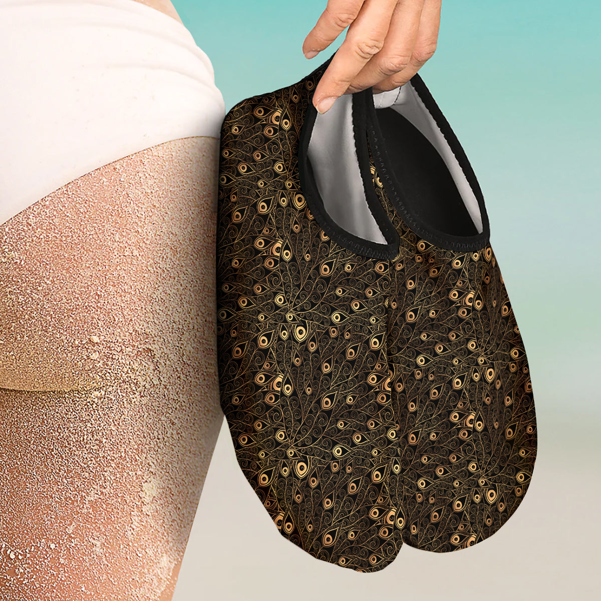 Feather Gold And Black Print Pattern Water Shoes