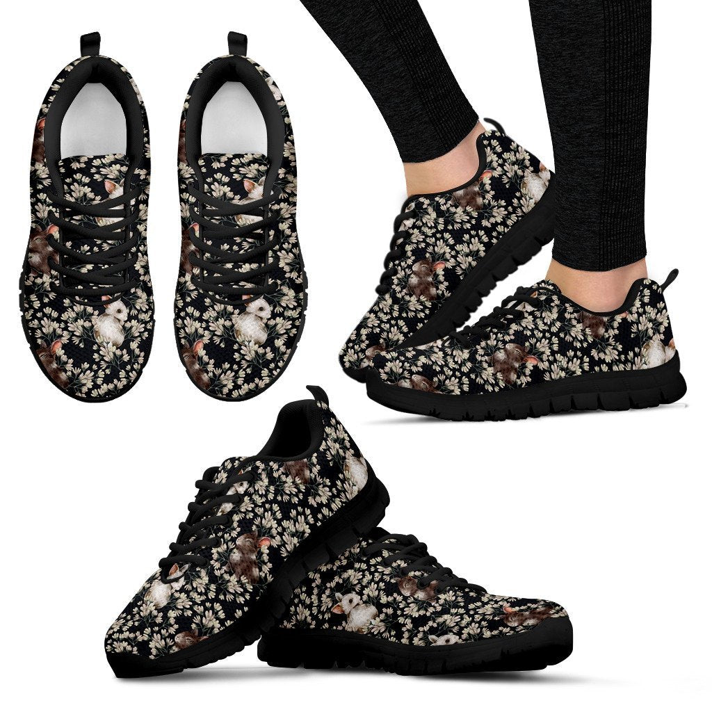 Floral Bunny Rabbit Pattern Print Black Sneaker Shoes For Men Women