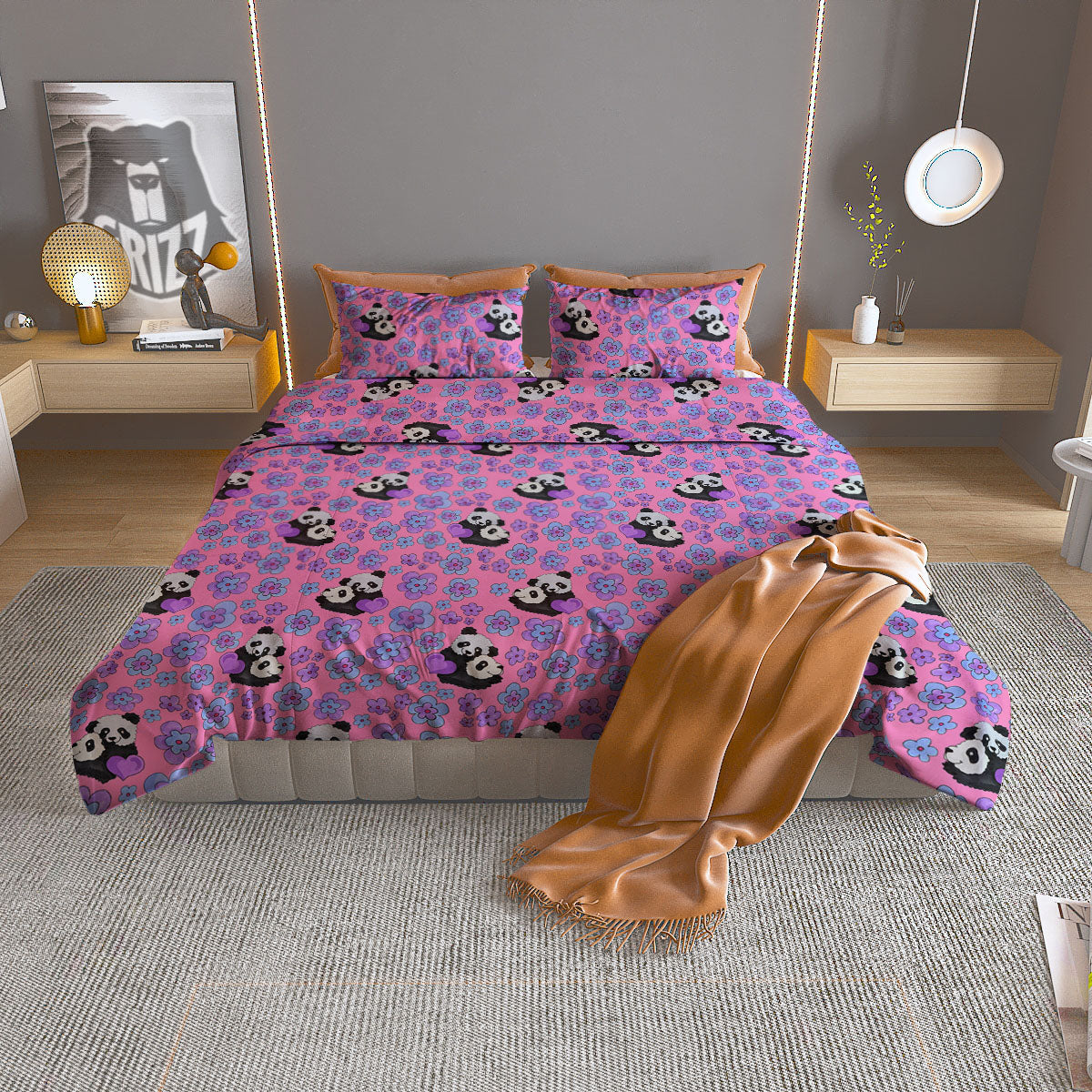 Flower And Purple Panda Print Pattern Duvet Cover Bedding Set