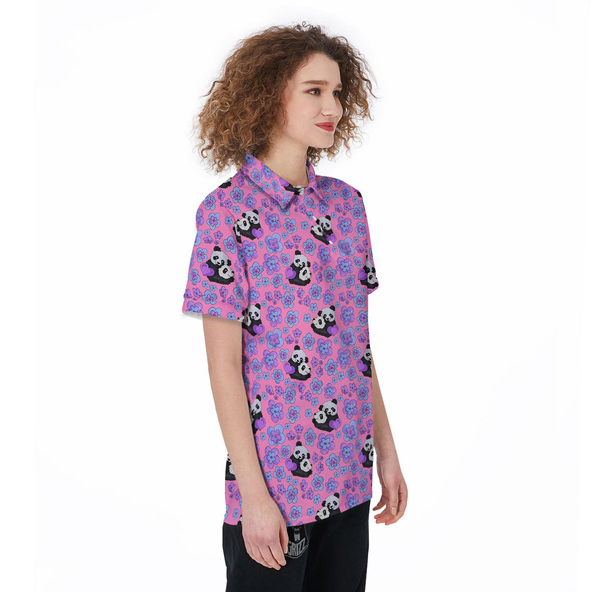Flower And Purple Panda Print Pattern Women's Golf Shirts