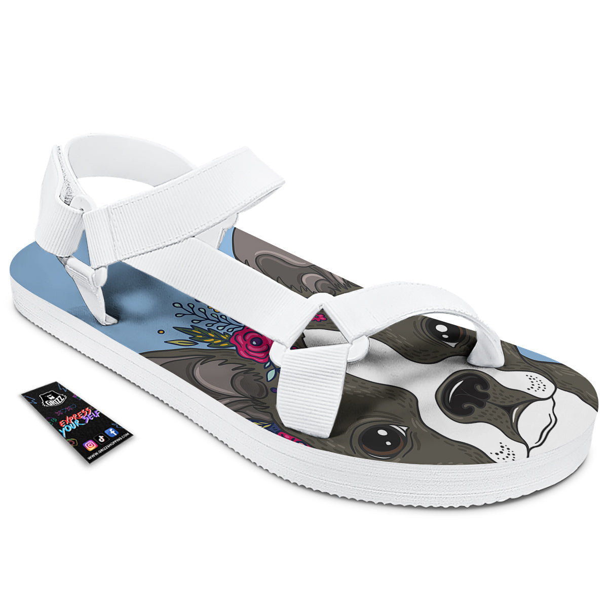 Flower Boston Terrier Cartoon Print White Open Toe Sandals