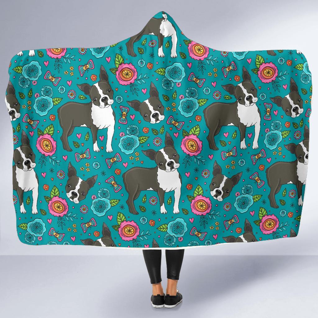 Flower Boston Terrier Pattern Print Hooded Blanket