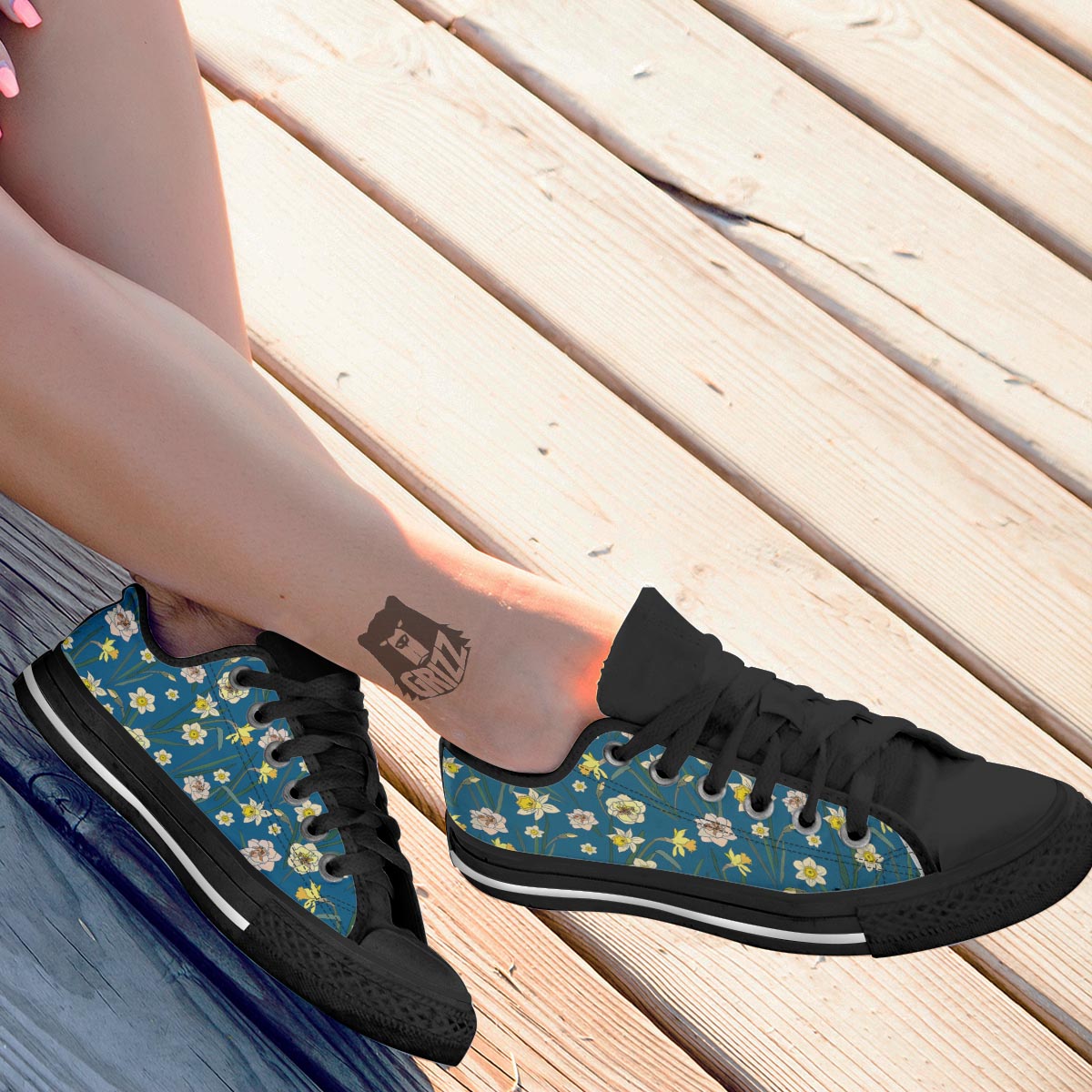 Flower Spring Daffodil Print Pattern Black Low Top Shoes