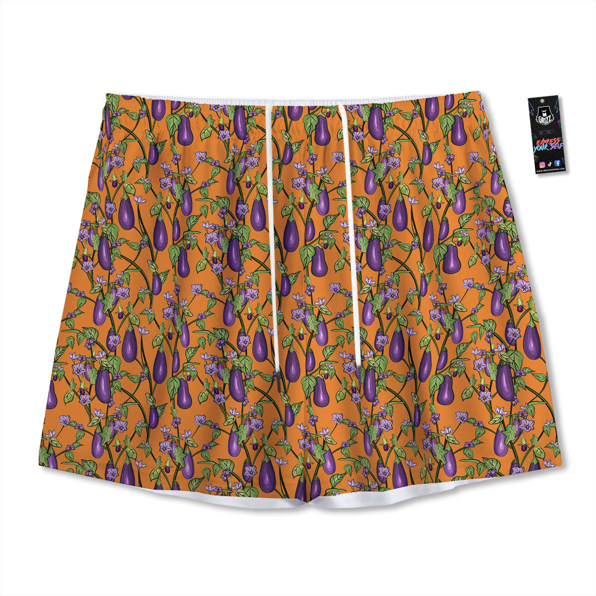 Flowers And Eggplant With Leaves Print Mesh Shorts