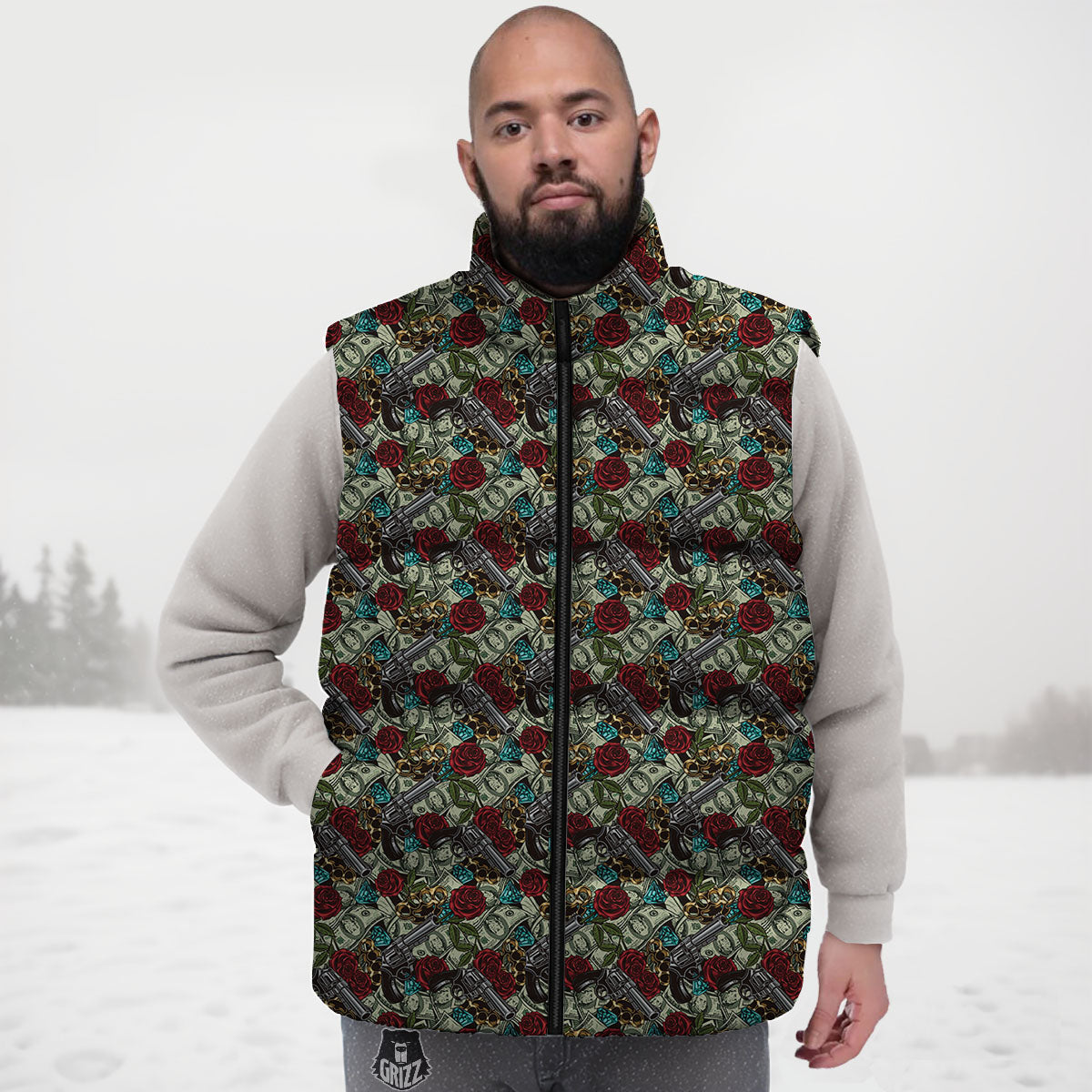 Looking for a unique Down Vest? Check out our Flowers Guns And Print Pattern Down Vest at Grizzshopping. Our down vest are handcrafted to the highest quality standards that custom made for you