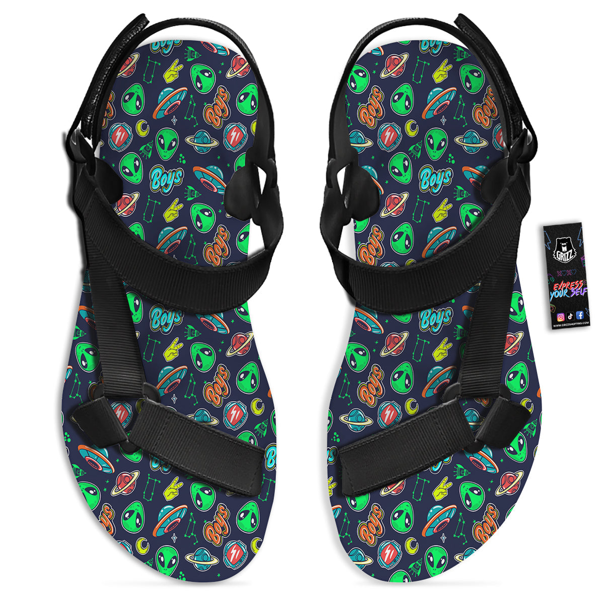 Geen Alien Ufo In Space Print Pattern Black Open Toe Sandals