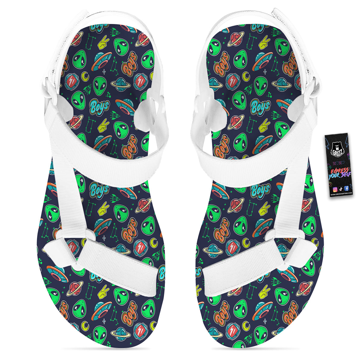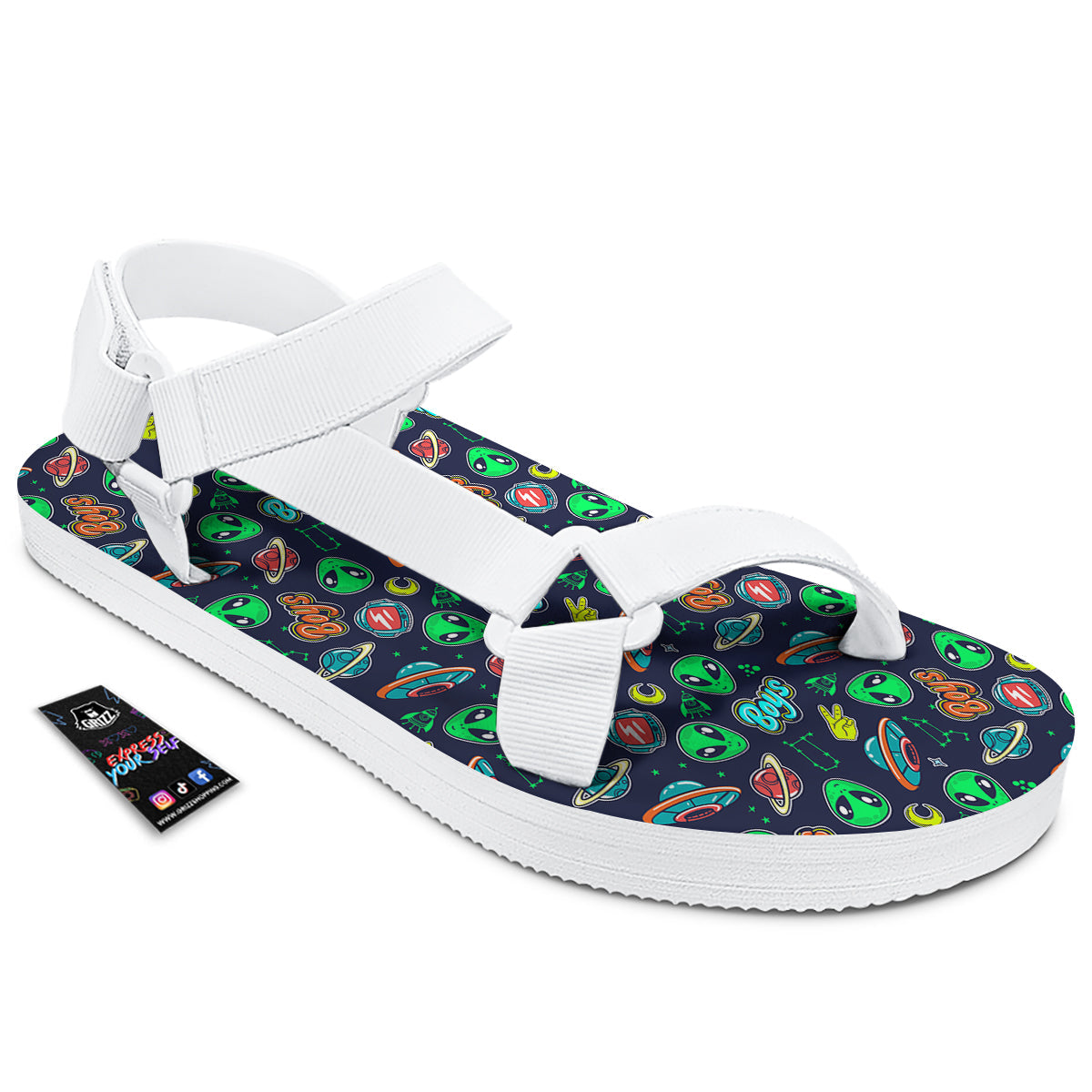 Geen Alien Ufo In Space Print Pattern White Open Toe Sandals