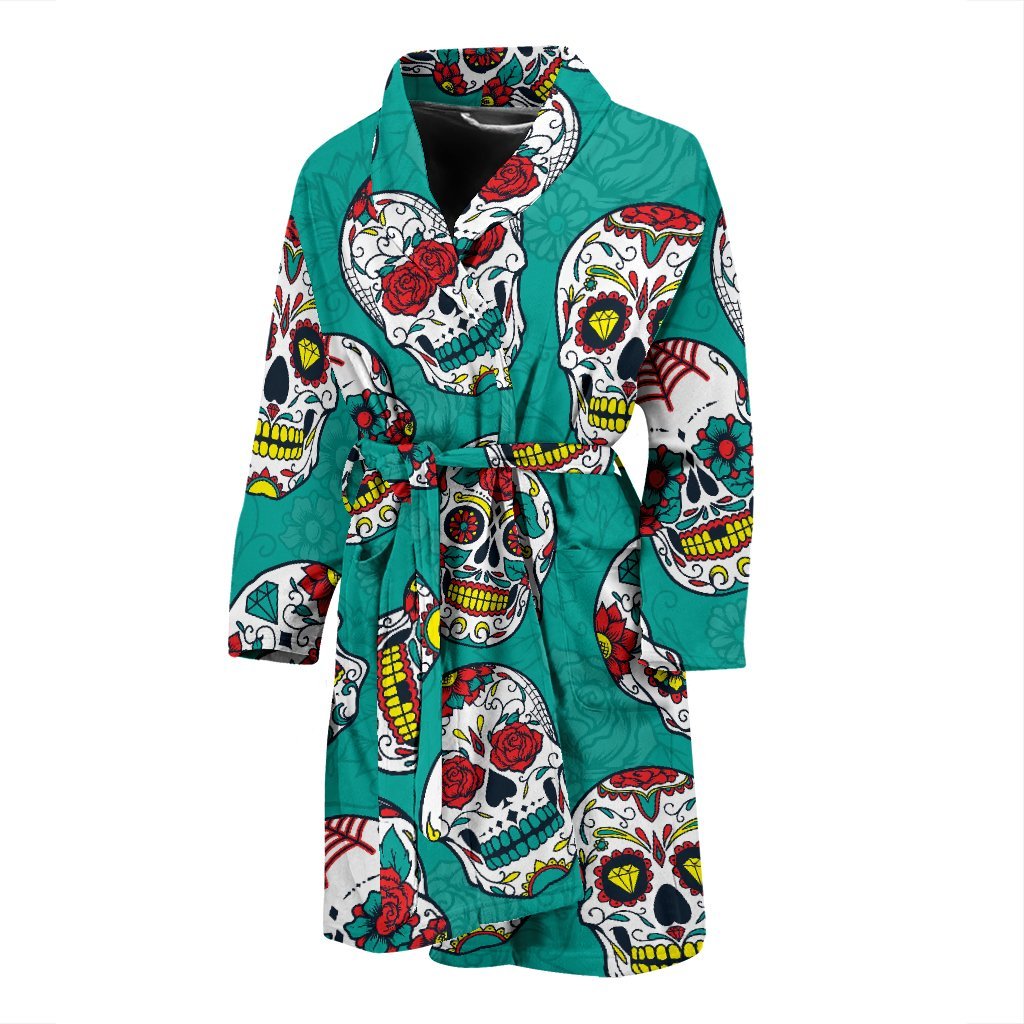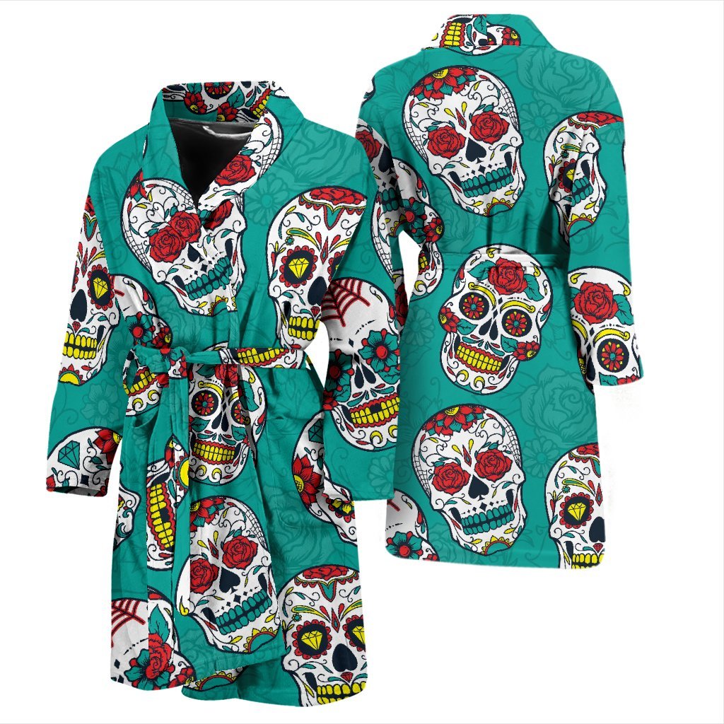 Girly Floral Rose Sugar Skull Skeleton Pattern Print Men Long Robe