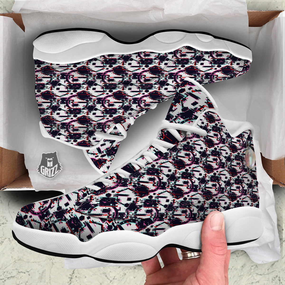 Looking for a unique basketball shoes? Check out our Glitch Effect Print Pattern White Basketball Shoes at Grizzshopping. Our basketball shoes are handcrafted to the highest quality standards that custom made for you